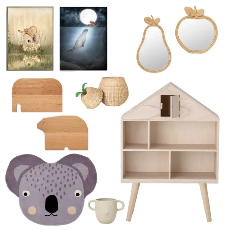 Skärbrädorna Aniboard från Ferm Living, korgen Pear från Ferm Living, dockhuset Berndt från Bloomingville.