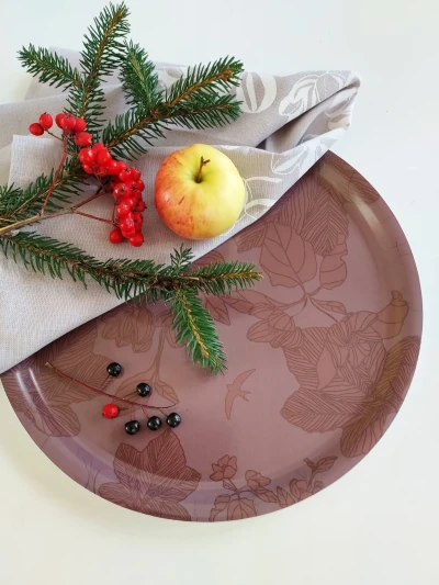 Ostrobothnia-julpaketet Sällskap innehåller den nya rostbruna Österbottenbrickan, en beige Äppelblom-kökshandduk samt en grå och en svart disktrasa.
