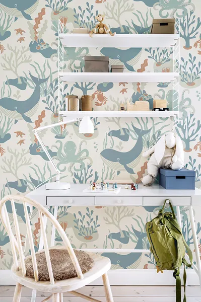 Denna tapet är det perfekta valet när du vill föra in havets magi i ditt hem och skapa en inspirerande och fantasifull miljö för ditt barn. Havet är djupt tapeten är en del av Hav & Land kollektionen, som har inspiration hämtad från Sveriges och Östersjöns kust. Kollektionen inkluderar både lekfulla och traditionella mönster för alla smaker.