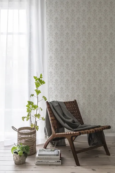 ![]() Beige Ljungbacka tapet har ett klassiskt salmiakmönster. |