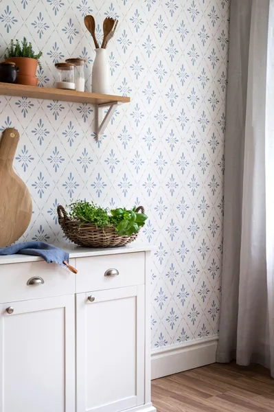 ![]() Blå Ljungbacka tapet är ett utmärkt val för exempelvis köket. |