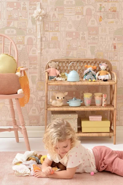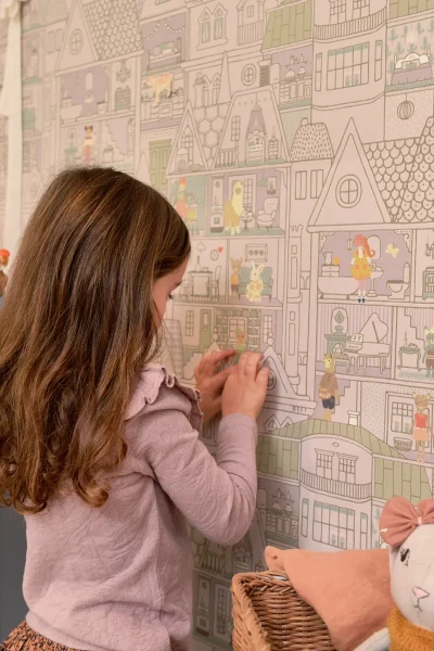 Tapeten Dollhouse är fantasirik med utsmyckade tak och rum som dockorna kan flytta in i. Separata wallstickers finns.