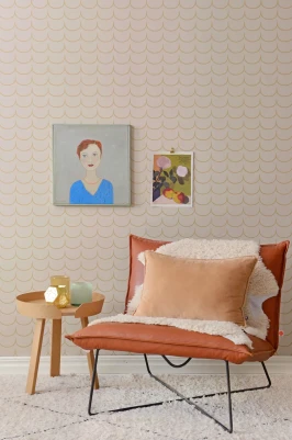 Tapeten Drop Curtain, med regelbundet grafiskt bågmönster, är en fräsch och lugn tapet som passar både i ungdomsrum och vardagsrum.