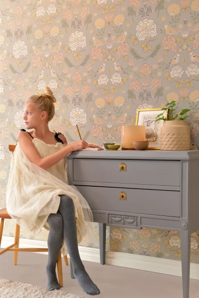 Också romantiska tapeten June (till höger) är en tapet som fungerar fast barnen blir tonåringar, eller till och med vuxna. Den har ett mönster av söta blommor och fåglar. Finns i fyra milda färgalternativ.