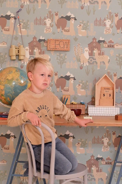 Tapeten Lama Village till vänster är en härlig tapet med lamadjur bland alptoppar och söta hus. Tapeten fås i fyra färgalternativ.