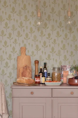 Tapeten Oak (till vänster), med eklöv i regelbundet mönster, fås i två färgalternativ.