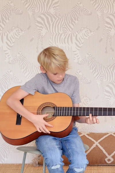 I ungdomsrummet passar till exempel tapeten Safari Stripe. Här samsas randiga zebror och tigrar. Två ljusa färgalternativ.