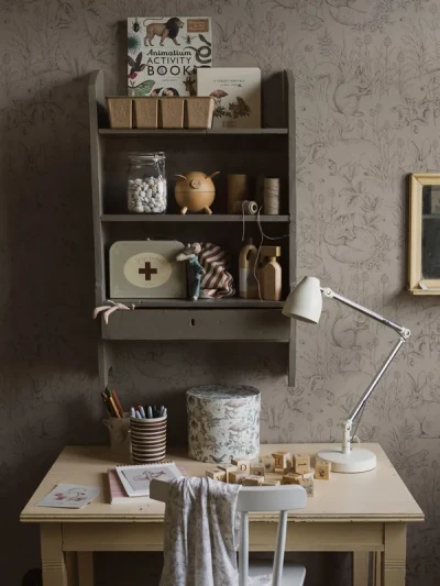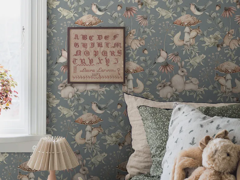 Populära djurtapeten Forest Friends fanns från förr i grönt och gråvitt. Nu finns den också i brunt och blått.