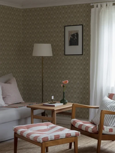 Tapeten Folklore är en allmogetapet och originalet kan dateras till 1950-talet. Den livfulla tapeten fås i fem harmoniska färger.