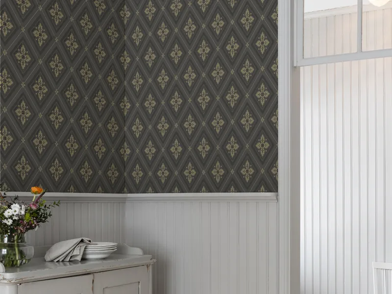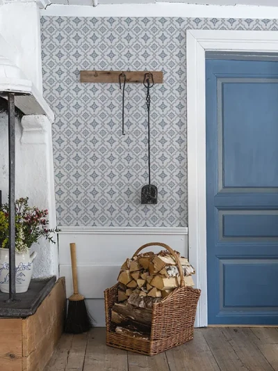 Geometriska tapeten Börsjö kommer från andra halvan av 1800-talet. På den här tiden började man också tapetsera symmetriska tapeter i taket. Non woven-tapeten Börsjö fås i fyra färger.