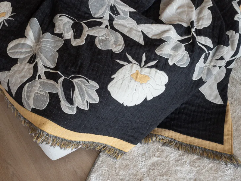Johanna throw blanket's delicate apple blossoms and midsummer roses beautifully meander along one edge. The throw blanket is double-sided, with a black or grey-beige background and a grey or yellow edge.