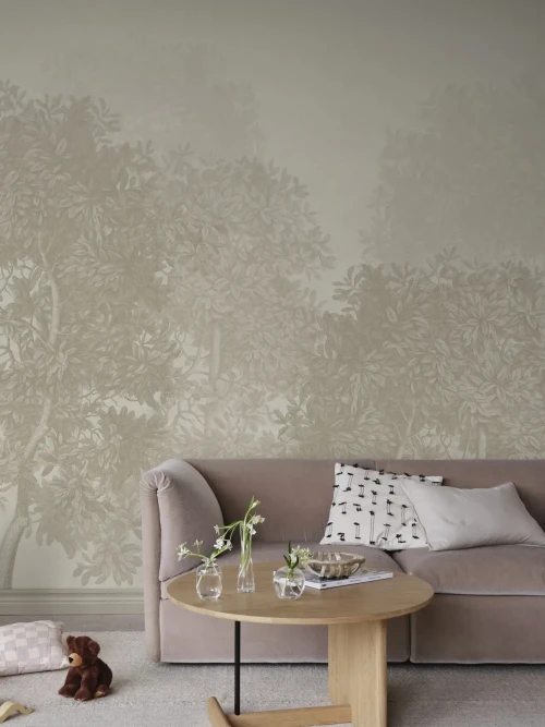 Panoramic forests, misty horizons and garden scenes create depth and a sense of calm. The colour palette stays muted and natural, allowing the wallpaper to support the room rather than dominate it.