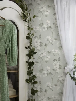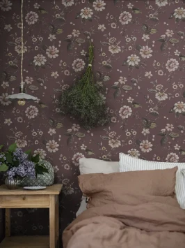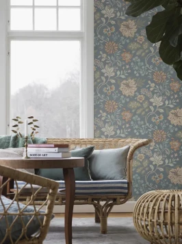The floral wallpaper Nightingale Garden has a dense pattern of flourishing flowers. The pattern was first created for fabric over 100 years ago. The wallpaper is romantic and comes in four different color options.