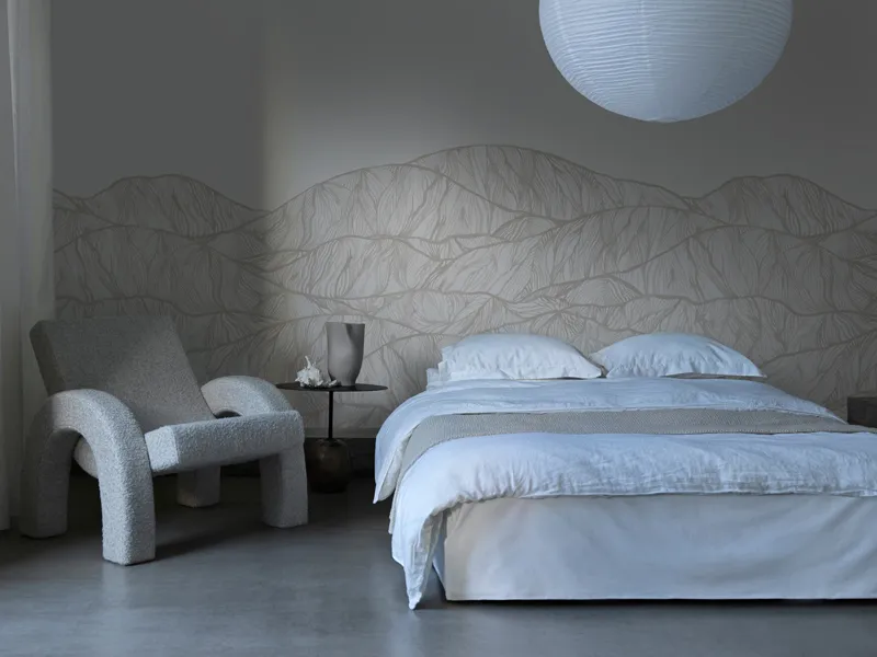 Mountain blends into the background and creates harmony in the room. For those who like mountain ranges in abstract form, there are also the colorful wallpapers Landscape and Coloured Mountains as well as the wallpaper Flow where the mountain pattern covers the entire wall.