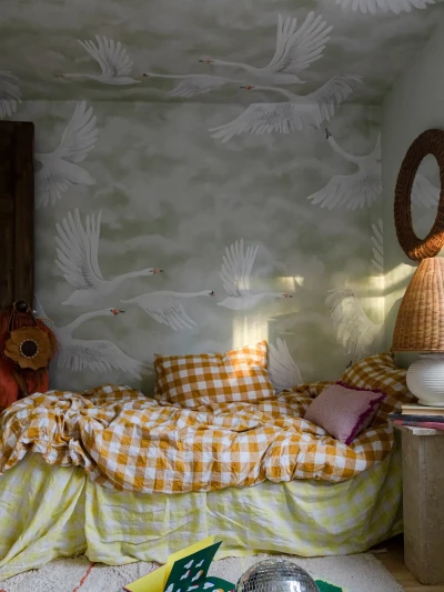 The wallpaper Clouds Swans can advantageously continue up to the ceiling. What could be more natural than lying in bed and seeing the swans fly by? The wallpapers Clouds and Stars In The Sky could also work well on the ceiling.