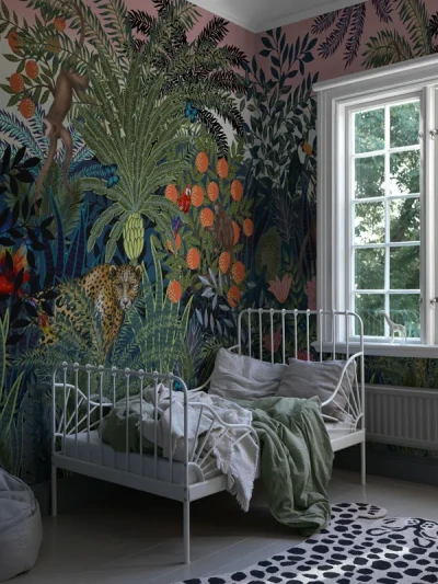 The colorful wallpaper Jungle Wall is like a large painting on the wall that really catches the eye. The wallpaper is available with and without animals. Another wallpaper with palms is the densely patterned Palm Leaf, which is an explosion of exotic plants, but in four mild color options.