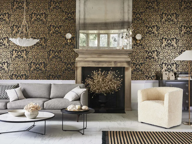 Metallic colors create a festive impression. When a subject sparks discussion, it also adds to the party atmosphere. Boscobel Oak wallpaper comes from Cole & Son.