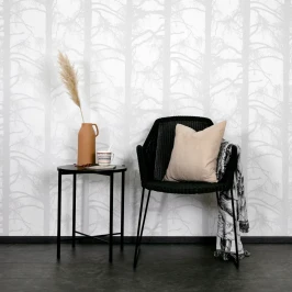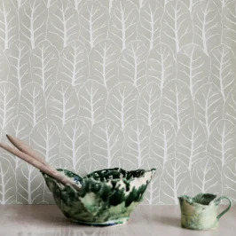 Domestic Classics - Vallila's classic patterns as wallpaper are never out of style. Here, Kelohonka with bare tree trunks in straight rows.