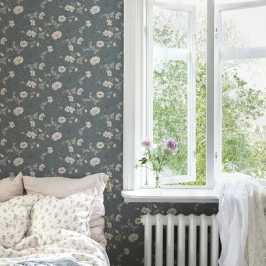 Ingrid Marie from Boråstapeter is a beautiful blue wallpaper depicting the annual journey of the apple tree - from spring blossoms to sun-ripened apples and red autumn leaves.