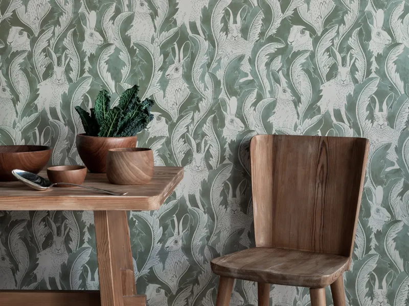 The wallpaper Hares in Hiding from Långelid/von Brömssen is an imaginative wallpaper with hares hiding among the leaves. The wallpaper is just as suitable in the kitchen and dining room as in the children's room.