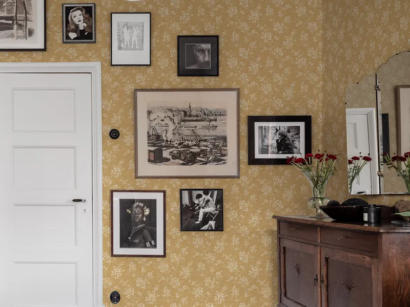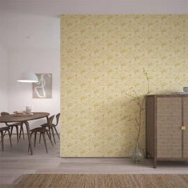 The wallpaper Hip Rose is warmly ochre yellow with small flowers. The vintage wallpaper is a classic that gives a cozy feeling in places like the kitchen, bedroom, or children's room. From Boråstapeter.