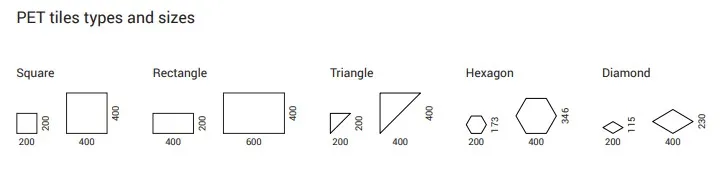 The acoustic tiles come in various shapes: squares, rectangles, triangles, hexagons, and diamonds, all available in two different sizes. See detailed sizes in the images.