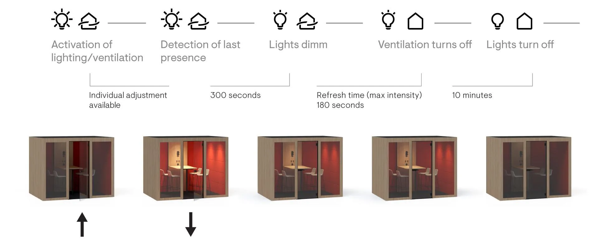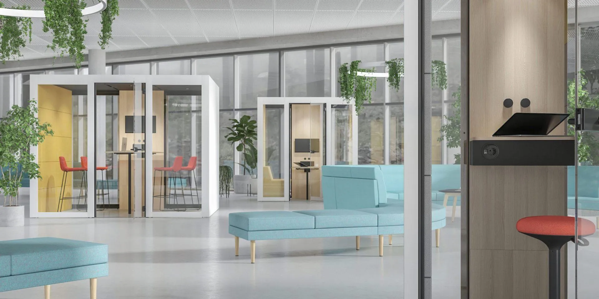 Thanks to SILENT ROOM's special design, the right level of sound absorption is guaranteed, blocking both incoming and outgoing noise. The internal acoustic walls are designed to eliminate echo in the room, creating a cozy atmosphere. The room is equipped with four powerful but quiet fans that, combined with three LED lights, create a warm and inviting feeling where you can perform tasks that require high concentration. The intelligent control unit adjusts ventilation and lighting to your needs, and activates stronger ventilation when a user leaves the room, all to prepare for the next user. For an enhanced quiet environment, models with upholstered outer panels are designed to further dampen sound, improving the acoustics of the entire office space.