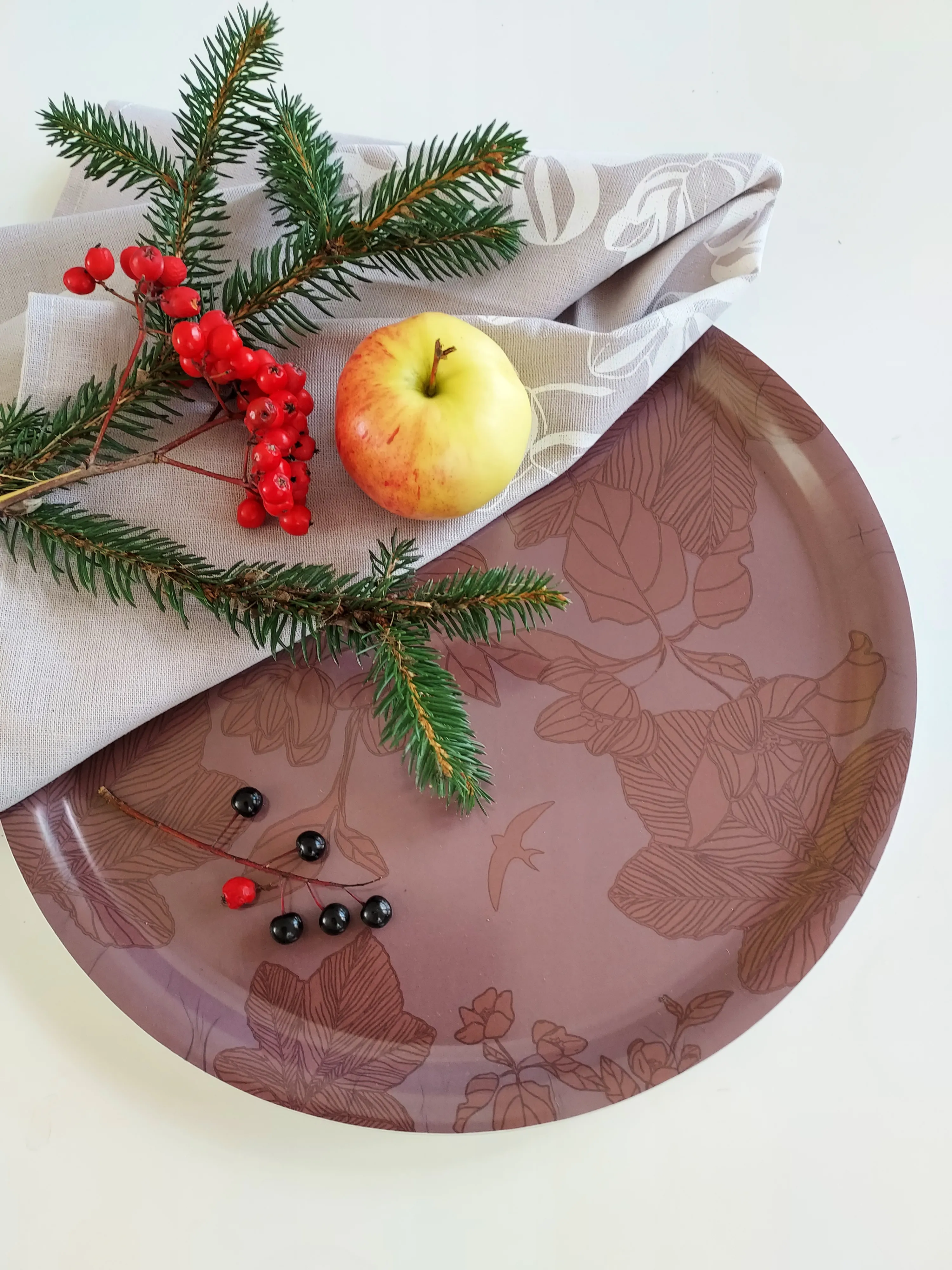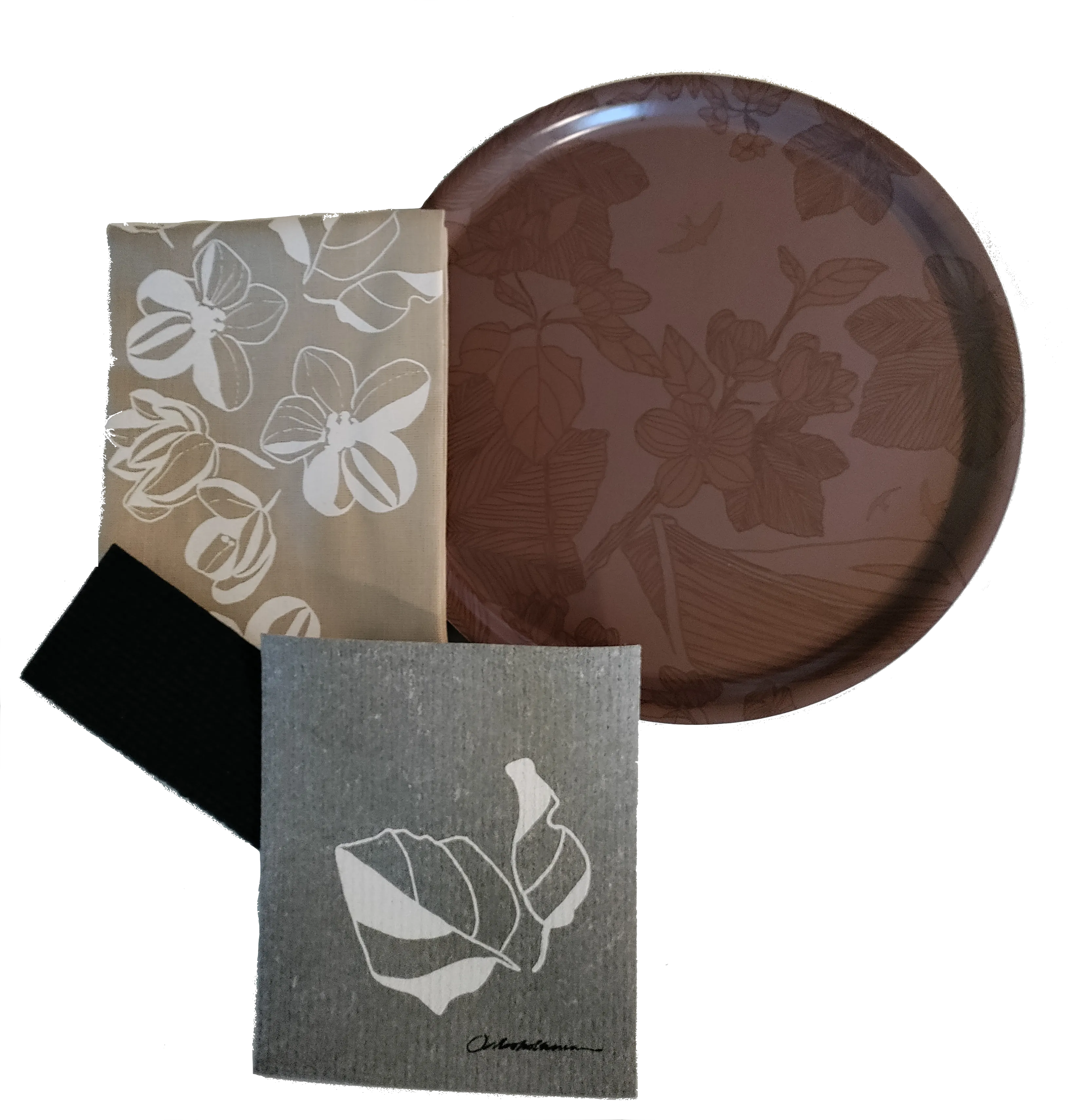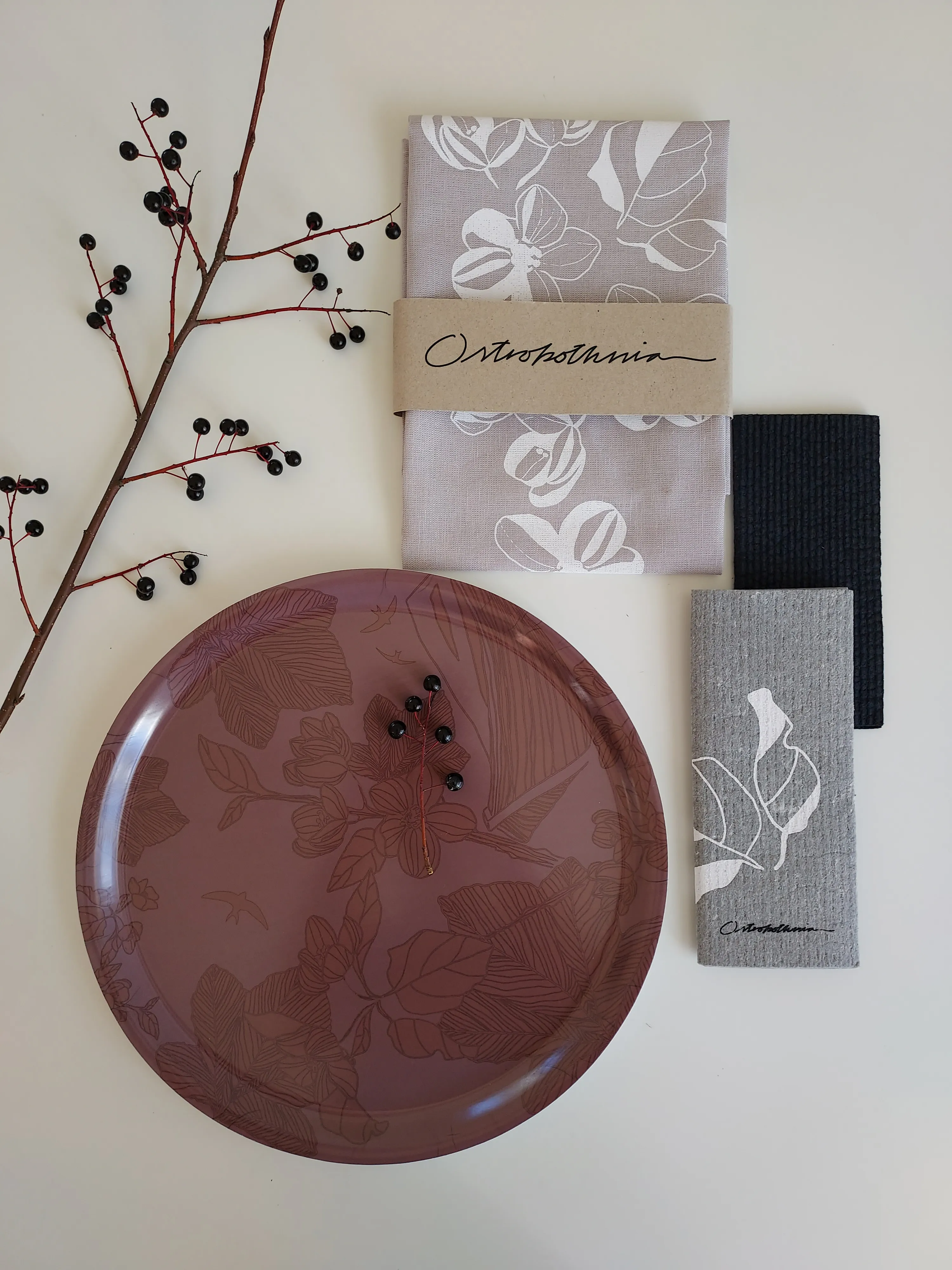 Christmas gift from Ostrobothnia - a rust-brown Ostrobothnia tray combined with the beige kitchen towel Apple Blossom, as well as a gray and a black dishcloth. The Ostrobothnia Christmas package is not only suitable for family members but also for company employees, business partners, and customers. Give the gift of lasting Christmas joy all year round!