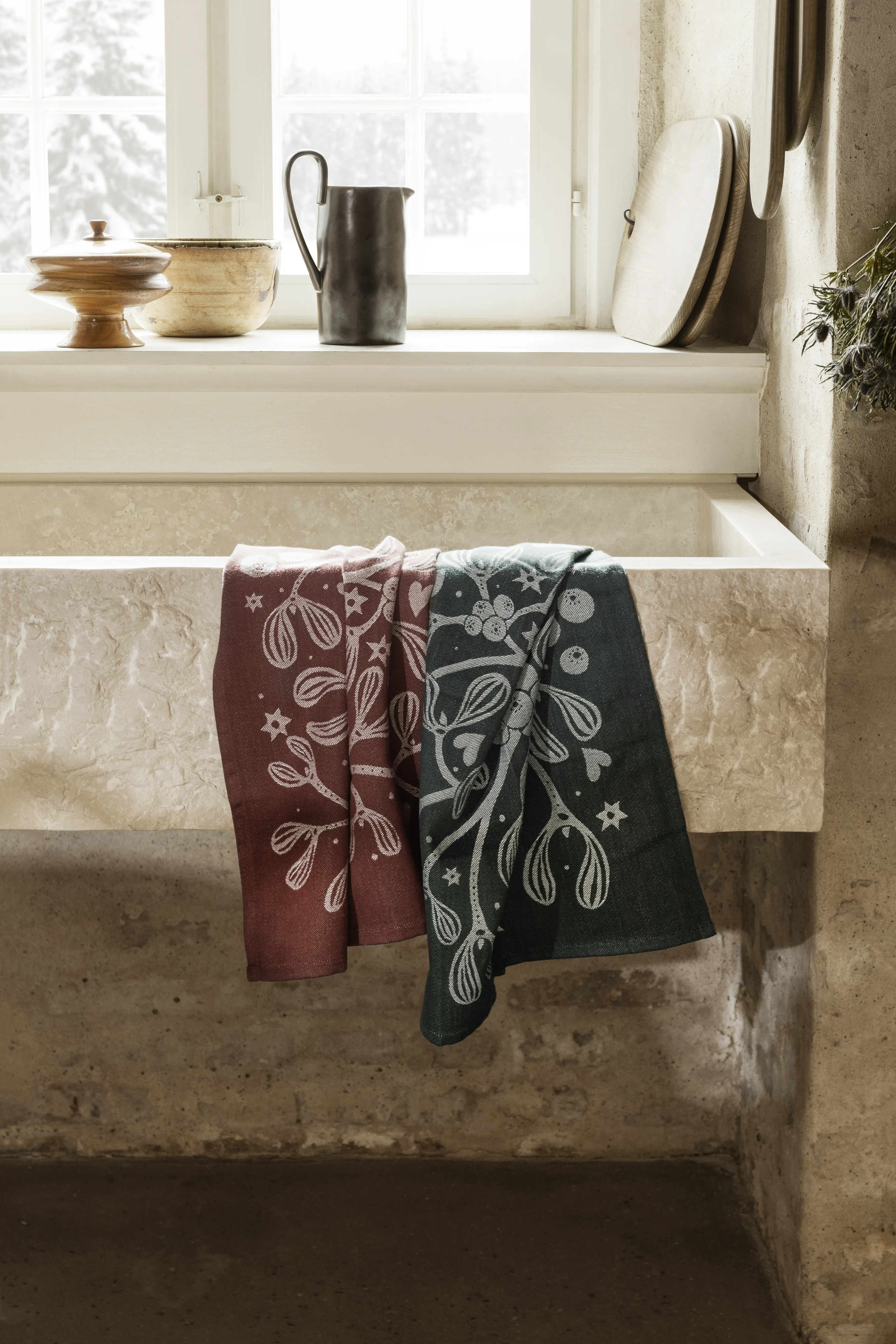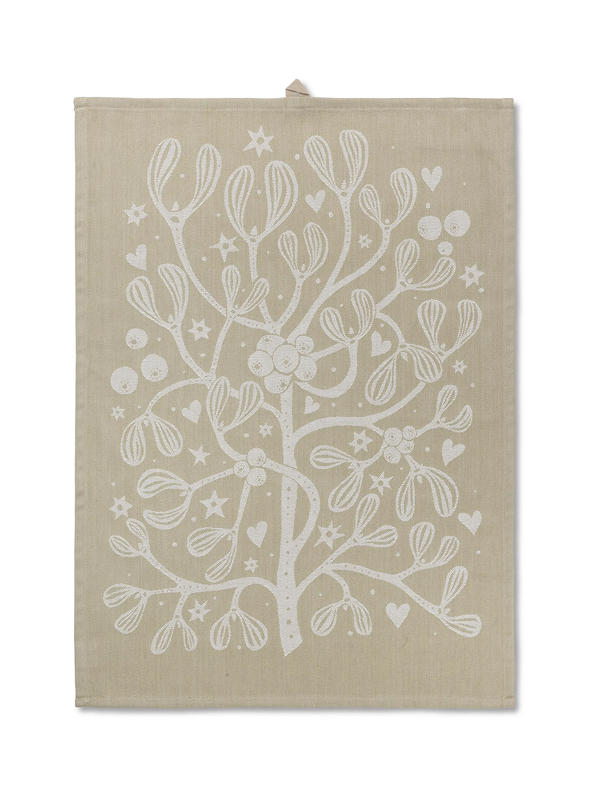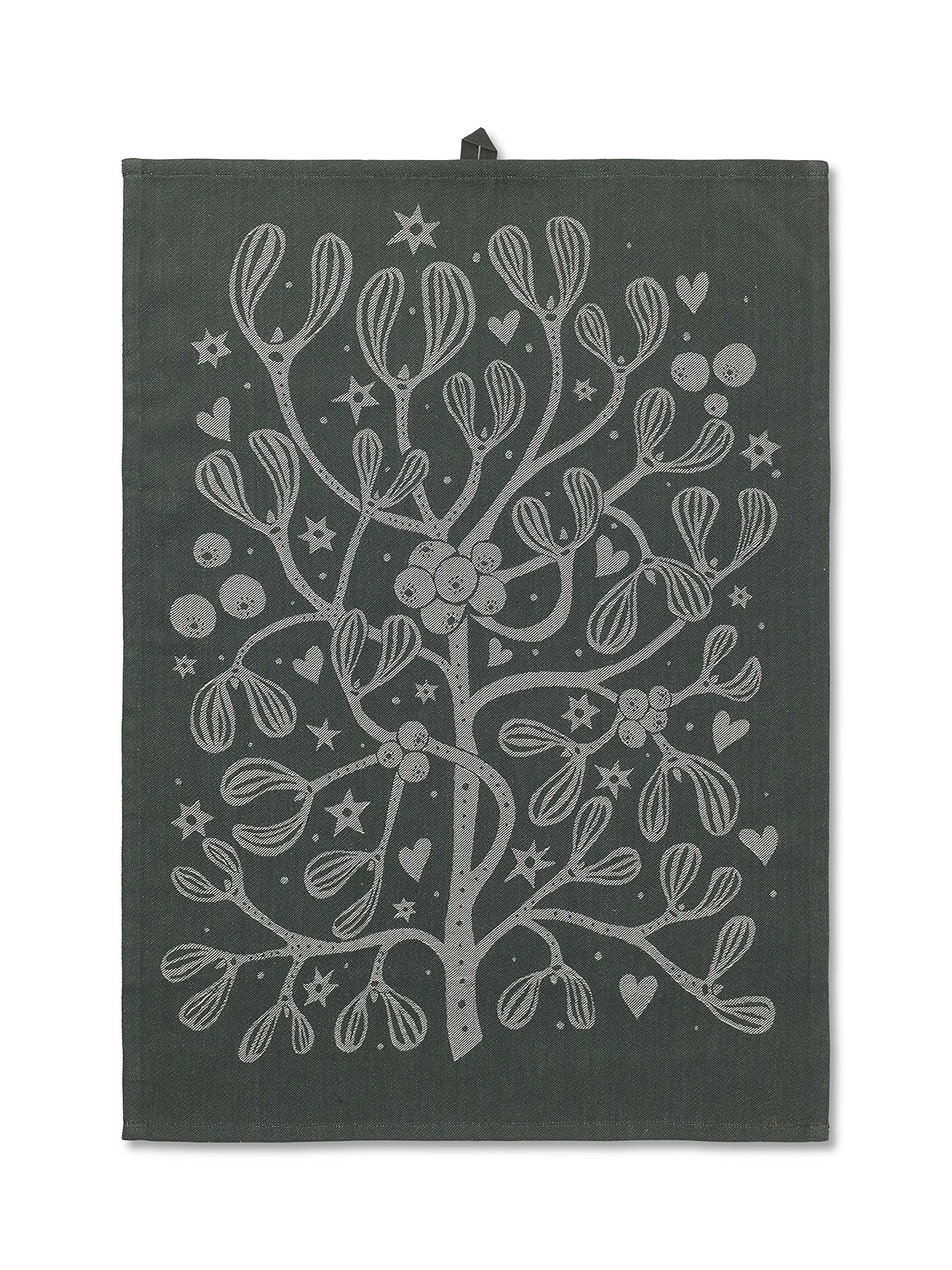 Mistletoe Tea Towel is a kitchen towel with a Christmas theme. The mistletoes on the kitchen towel spread holiday cheer. Three color options.