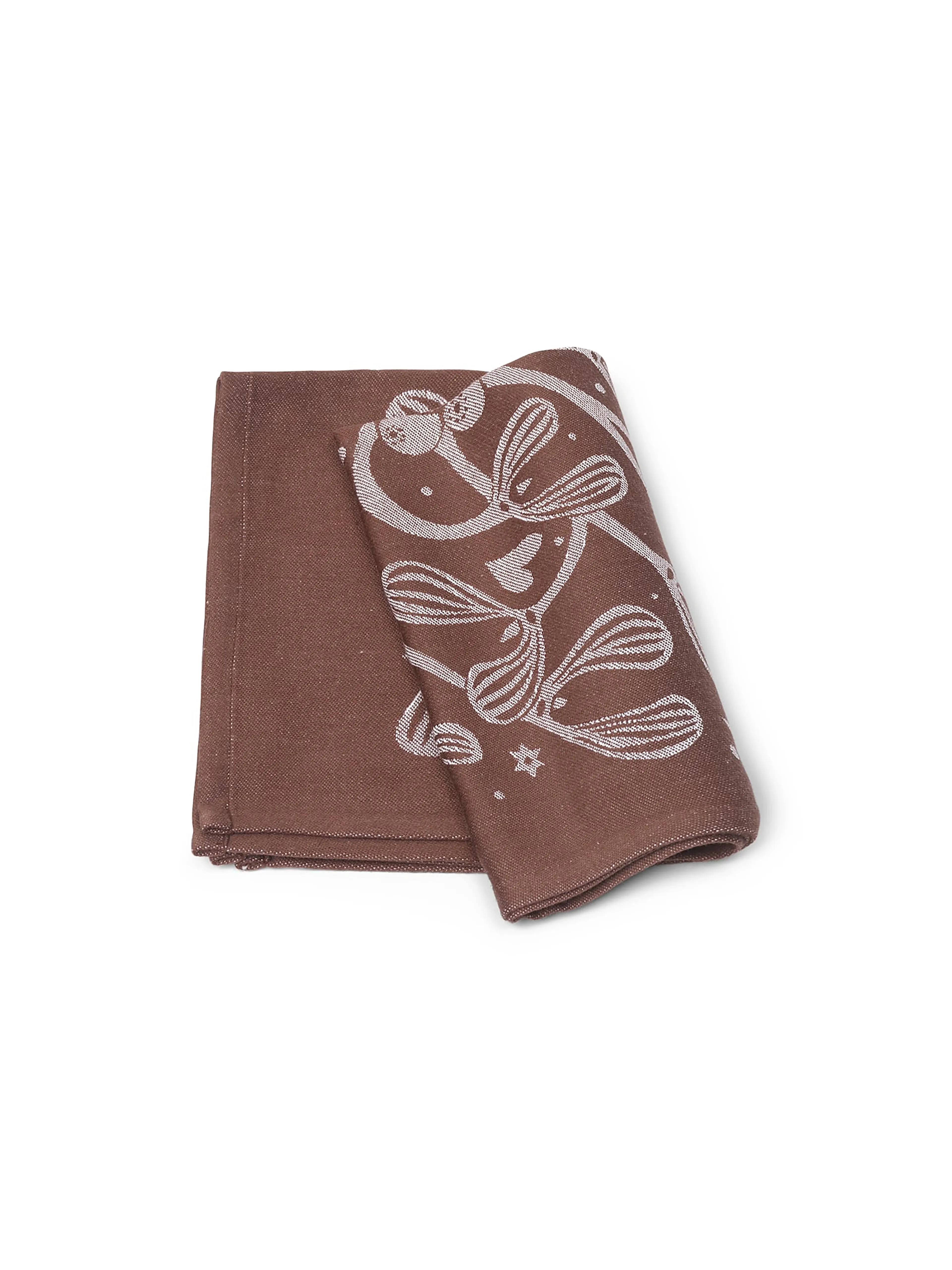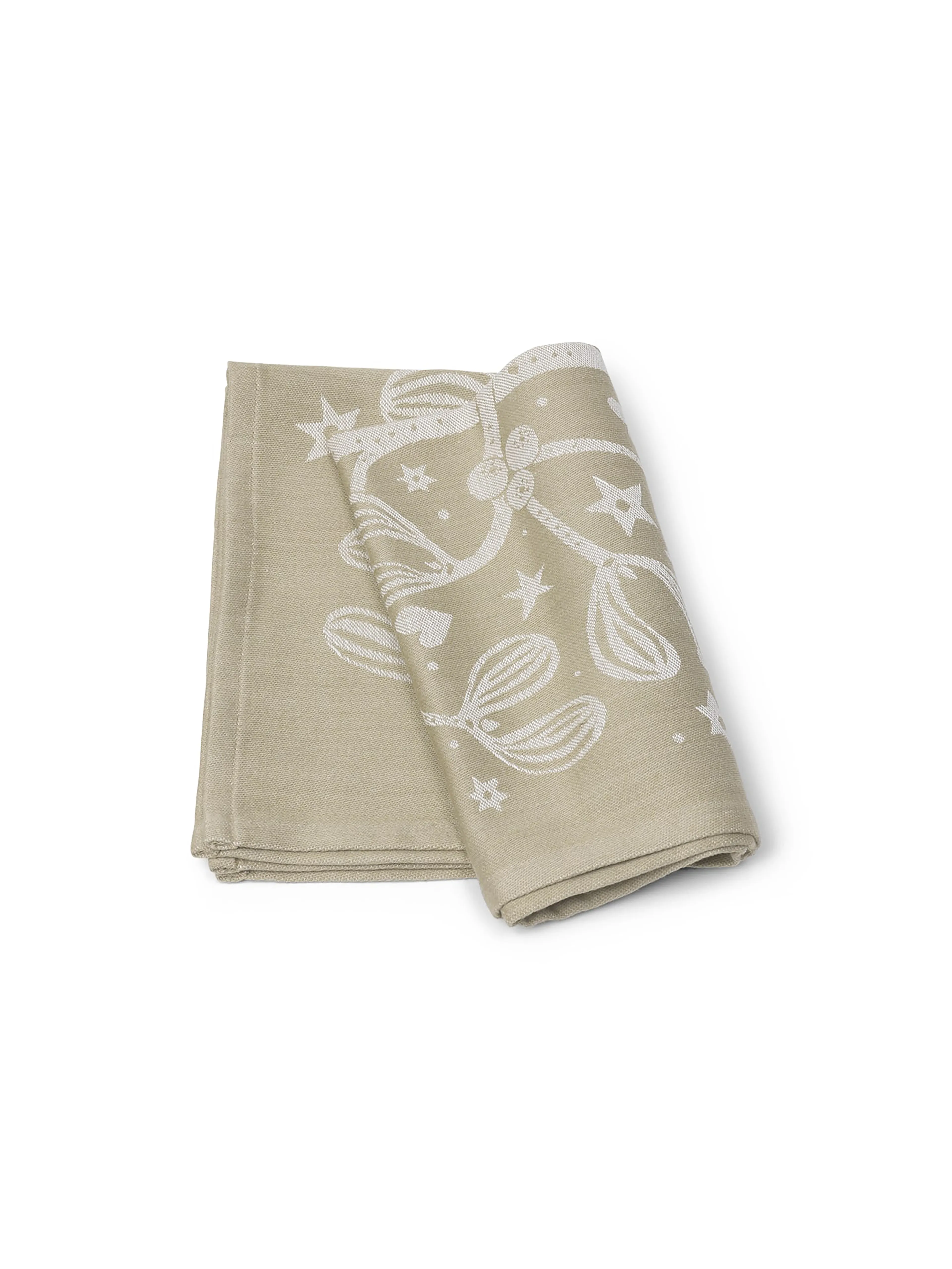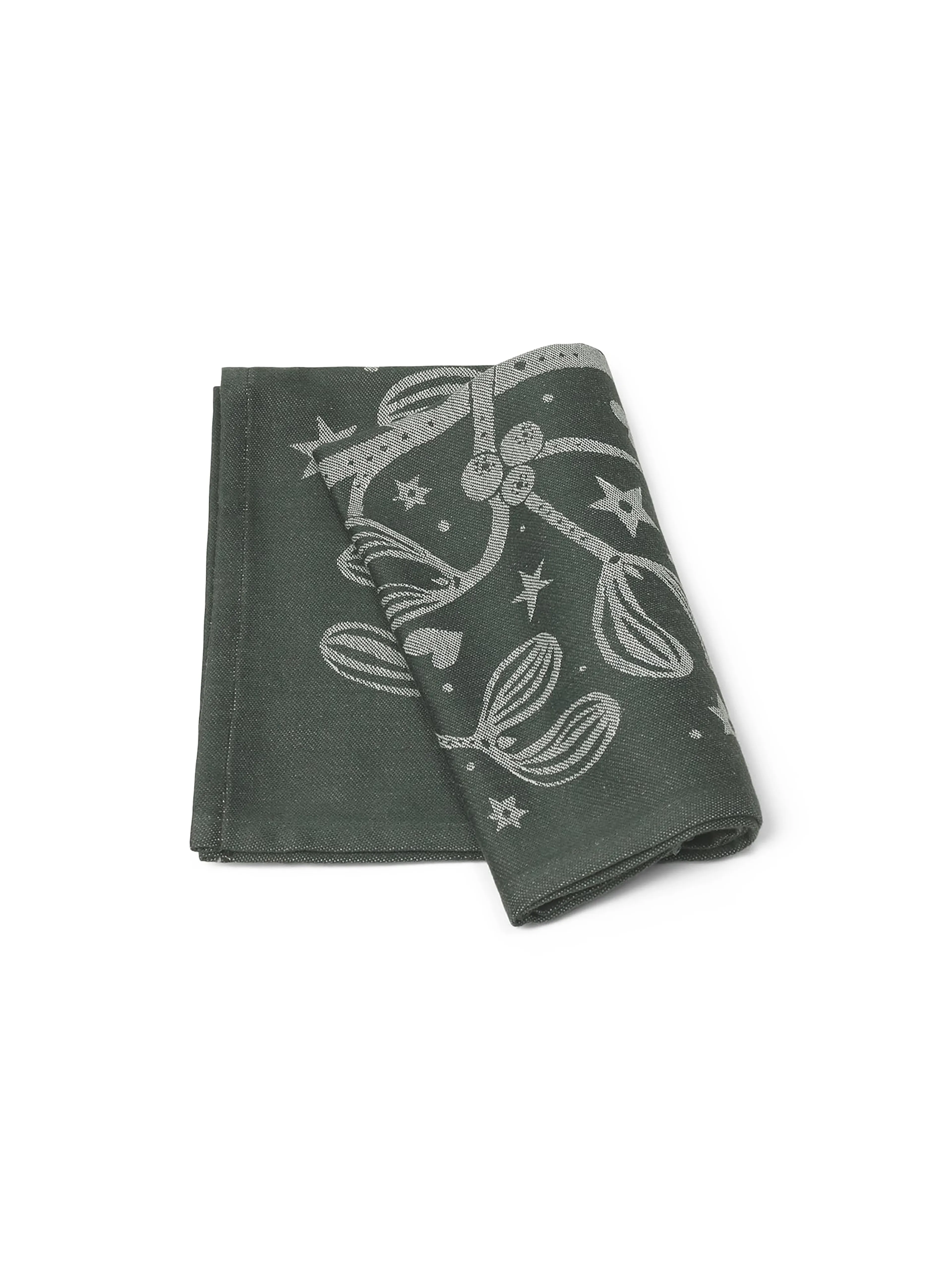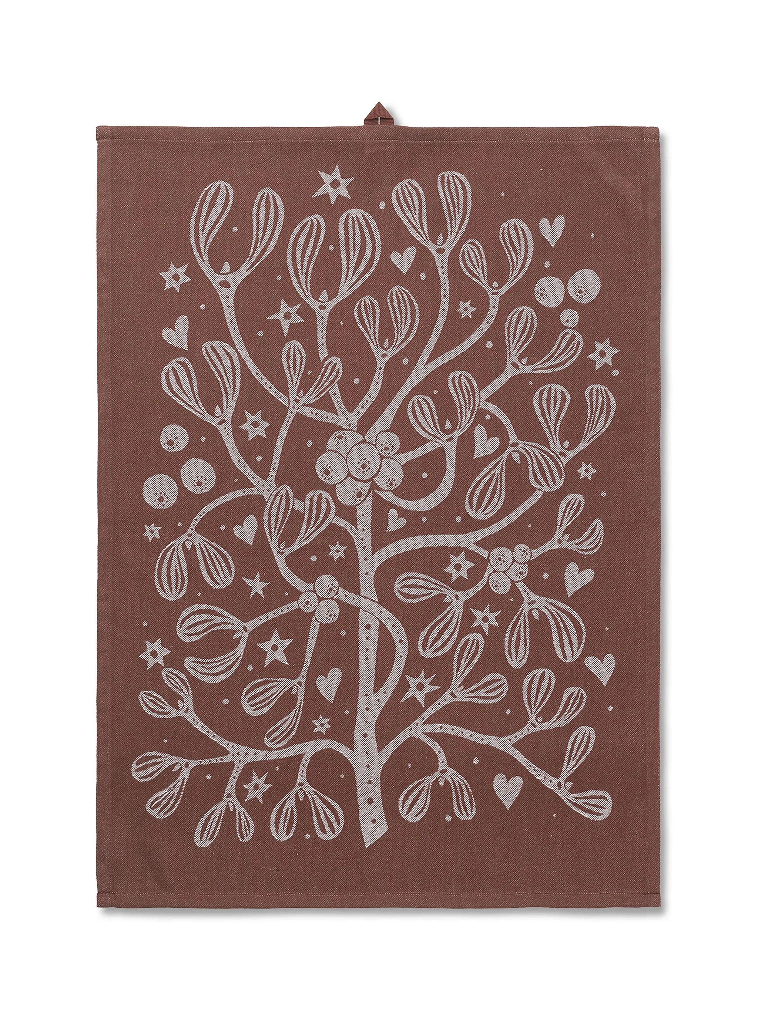 Mistletoe Tea Towel is a kitchen towel with a Christmas theme. The mistletoes on the kitchen towel spread holiday cheer. Three color options.
