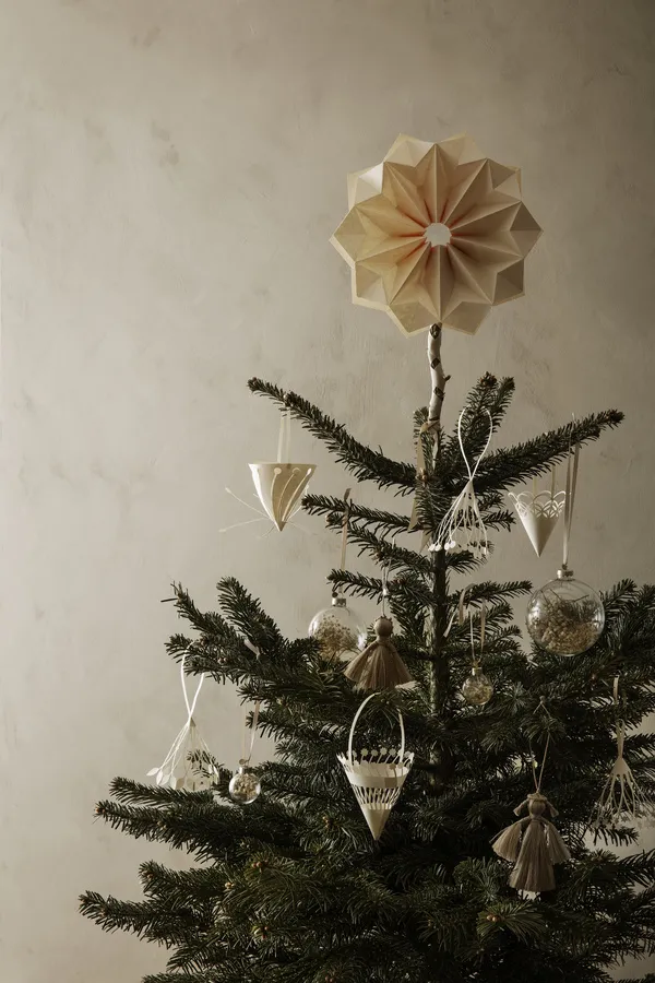 The Julstjärnan Paper Star Sun in paper is a modern twist on the classic paper star. The star can be hung in the window with the beautiful two-meter-long ribbon that comes with it, or wrapped around the top of the Christmas tree and used as a tree topper. A beautiful storage box is included.