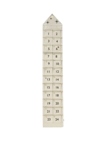 Ferm Living's narrow Star Christmas calendar with 24 small fabric pockets for small Christmas gifts in December. In addition to candy, you can also put small packages in the pockets! Thanks to its long narrow shape, the calendar fits in small spaces such as between two doors or narrow rooms. Available in dark green and gold or sand-colored and black.