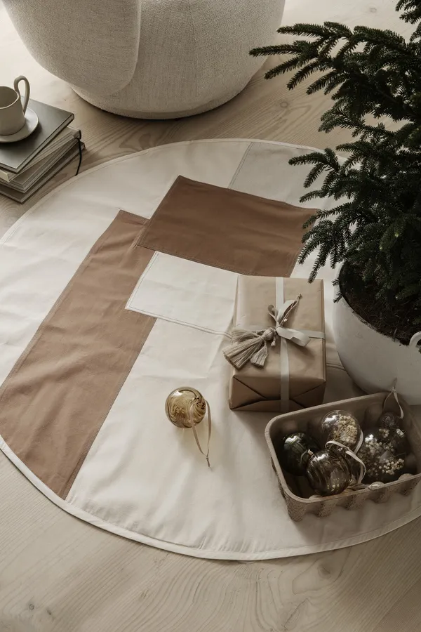 The modern Christmas tree skirt Tonal Christmas Blanket is an elegant beige with brown patches overlapping each other. A beautiful Christmas tree skirt for modern homes, it is equally suitable to use throughout the rest of the year.