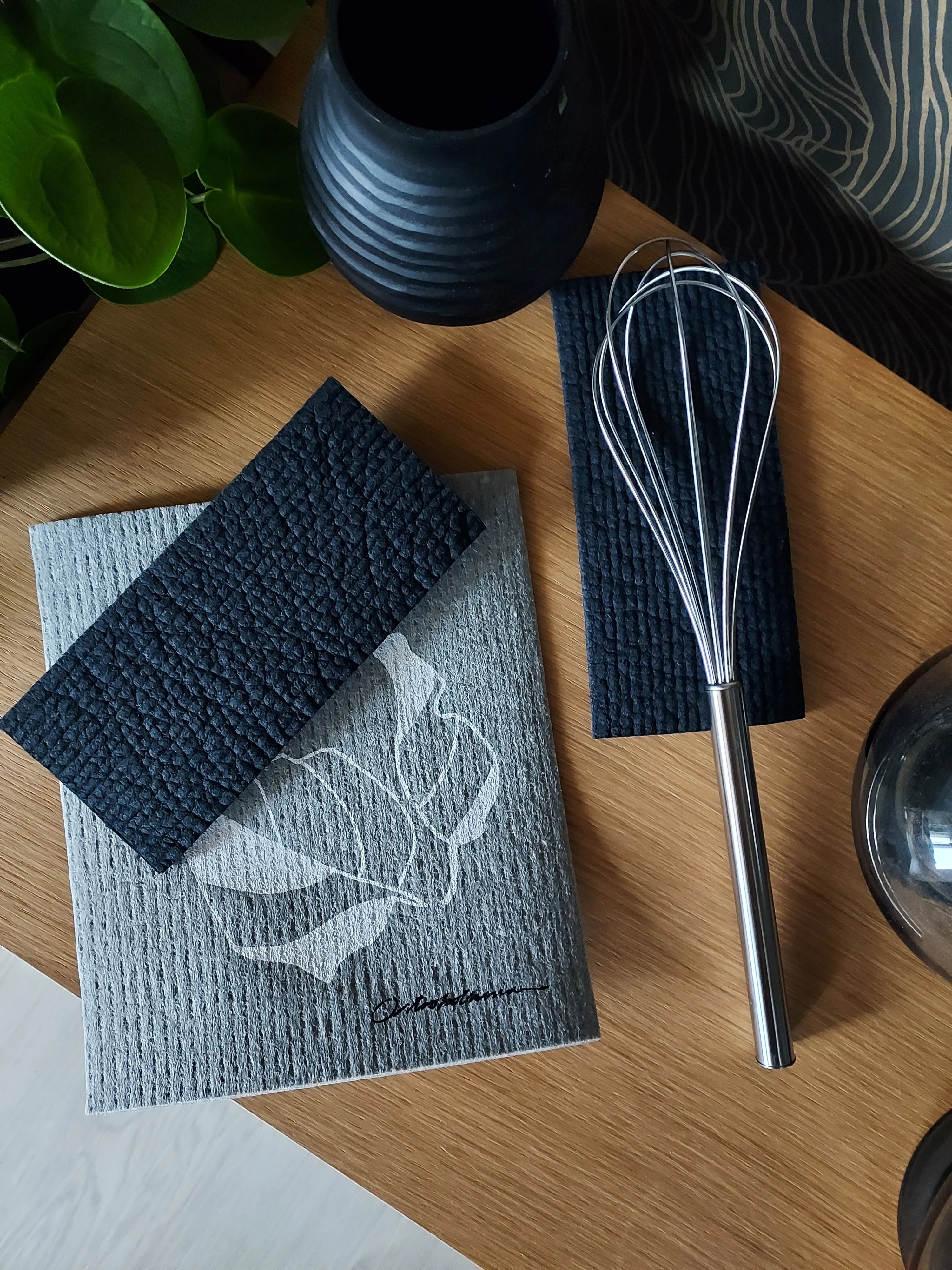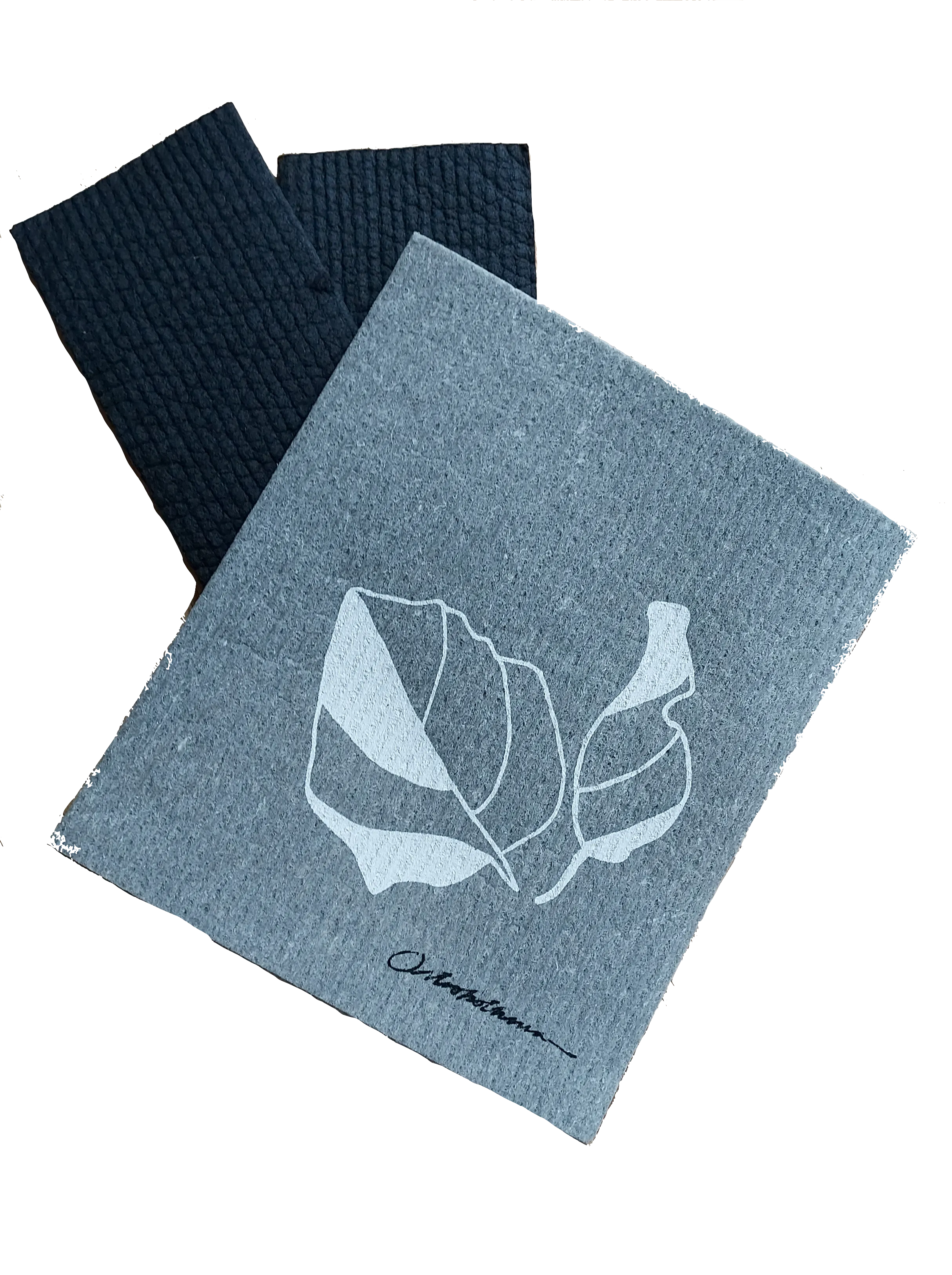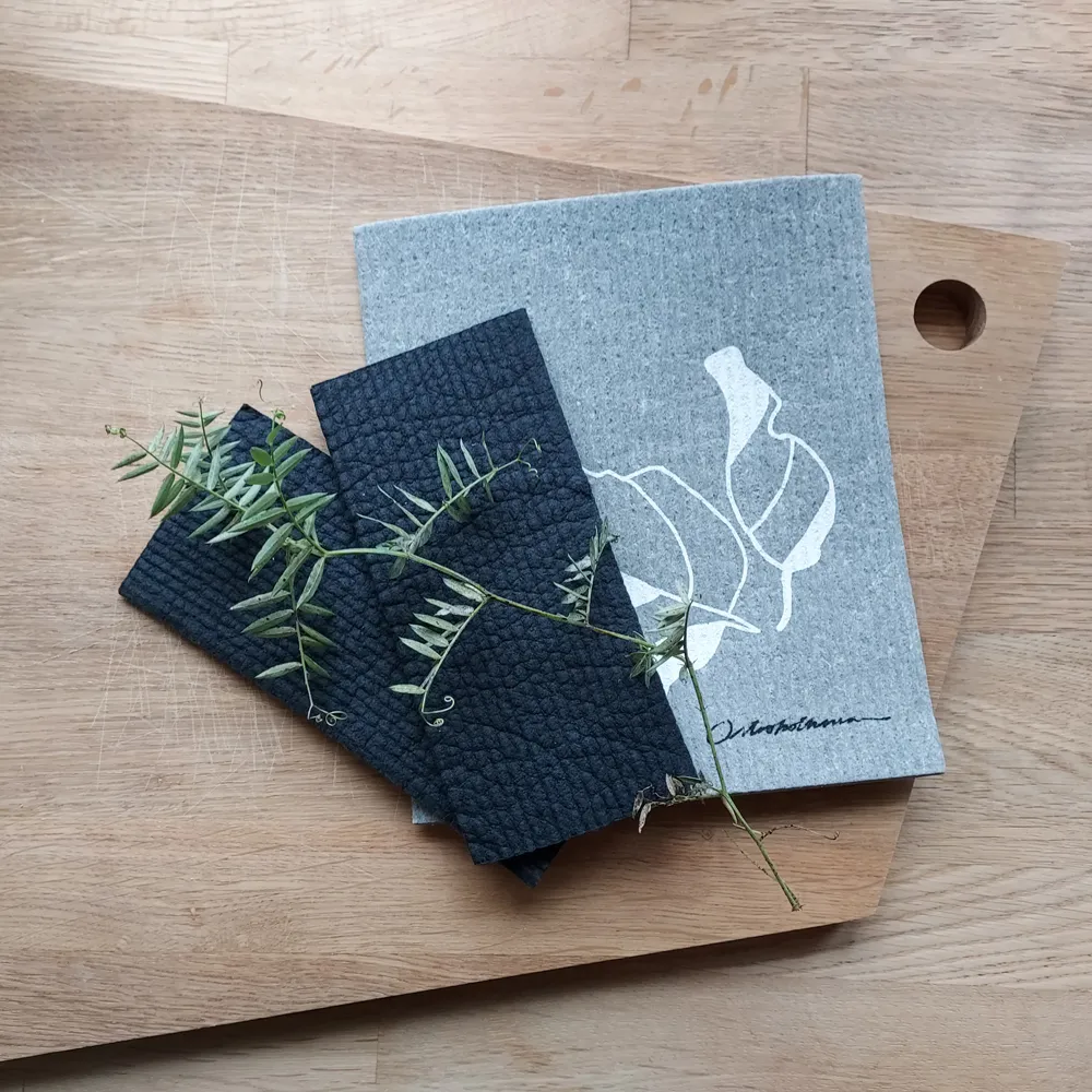 The Äppelblom dishcloths from the Österbotten series are environmentally friendly, can be washed at 90 degrees, and composted when they are no longer used. A package includes two all-black cloths and one gray patterned cloth with leaves recognizable from the Österbotten trays. Stylish dishcloths for every kitchen!