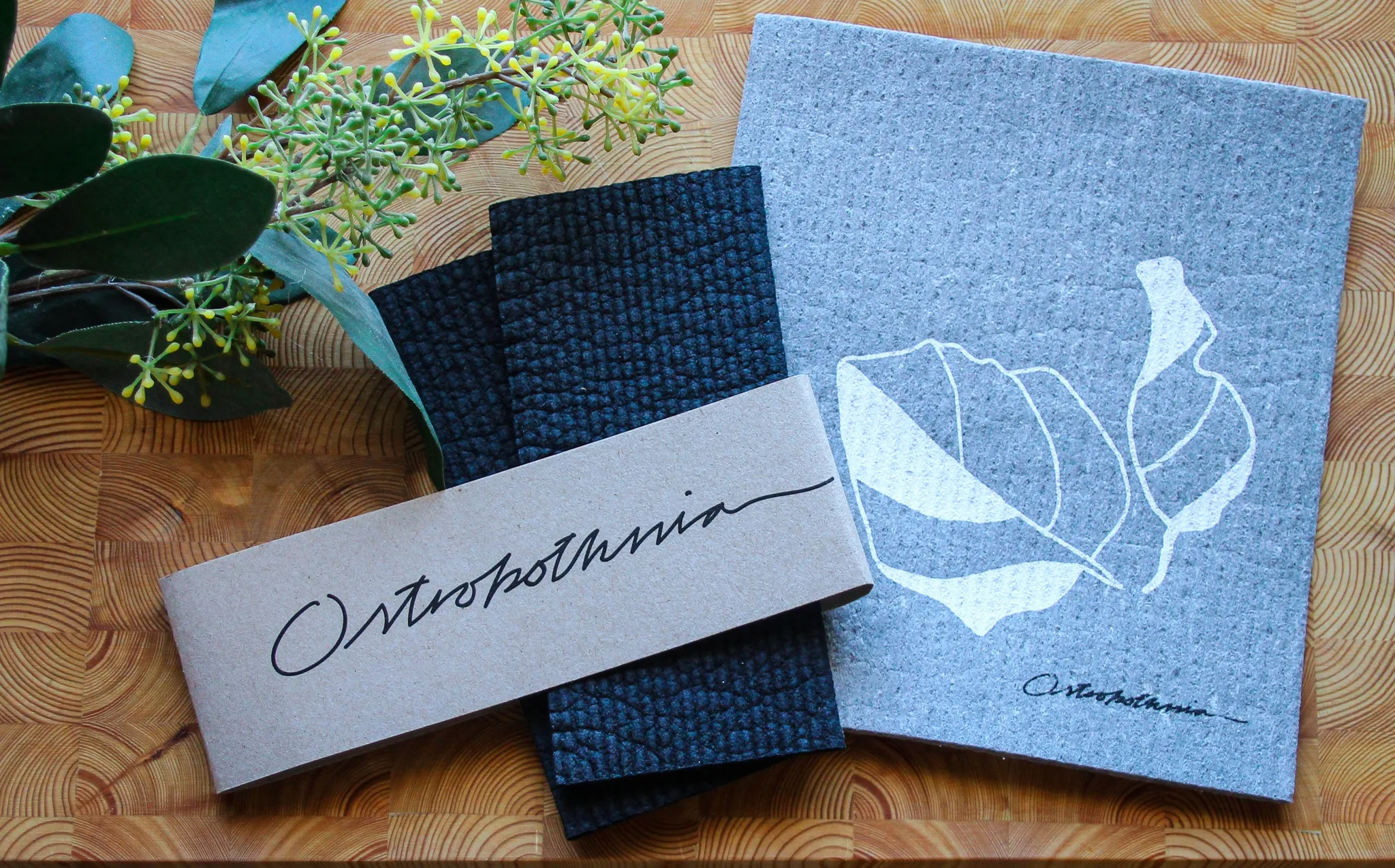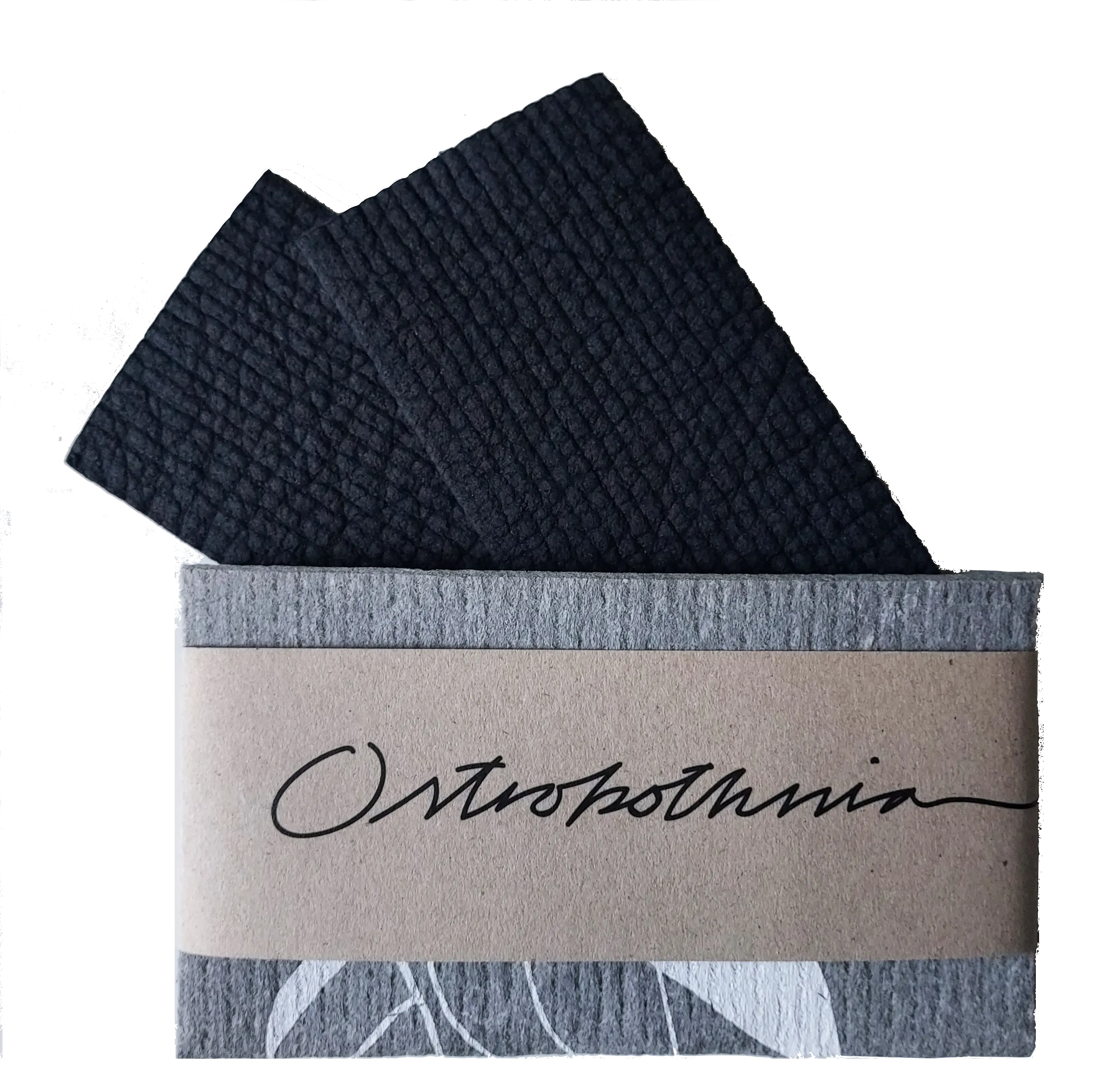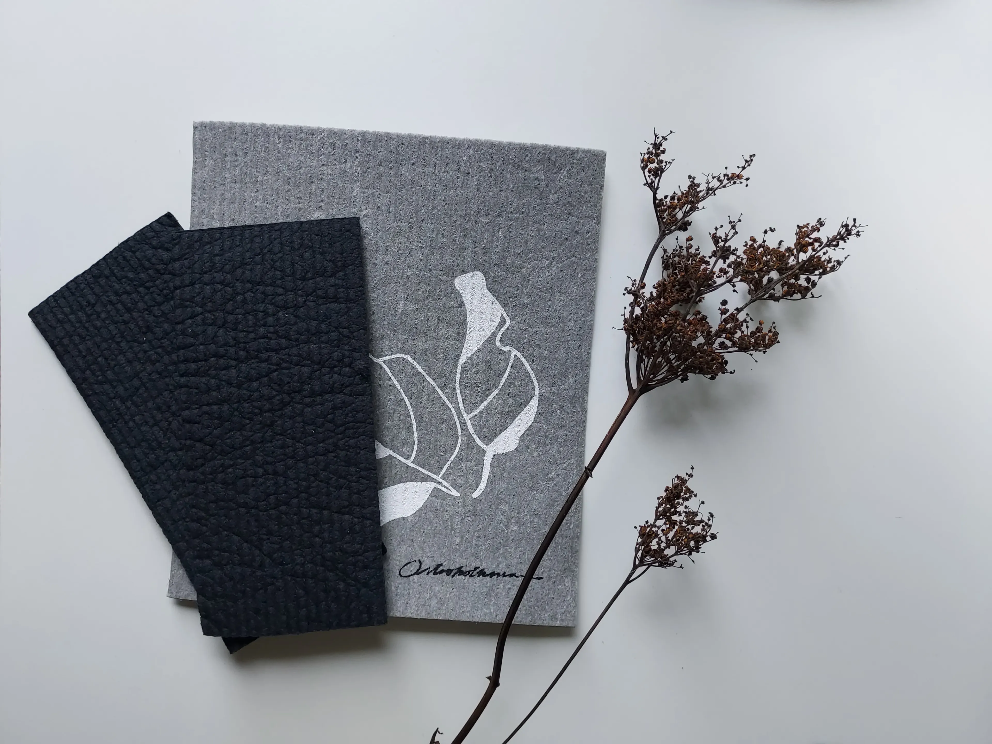 The Äppelblom dishcloths from the Österbotten series are environmentally friendly, can be washed at 90 degrees, and composted when they are no longer used. A package includes two all-black cloths and one gray patterned cloth with leaves recognizable from the Österbotten trays. Stylish dishcloths for every kitchen!