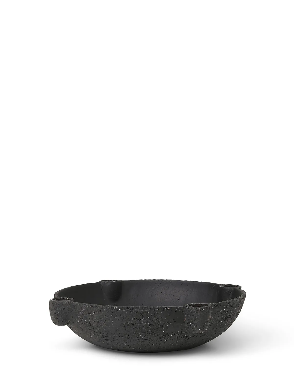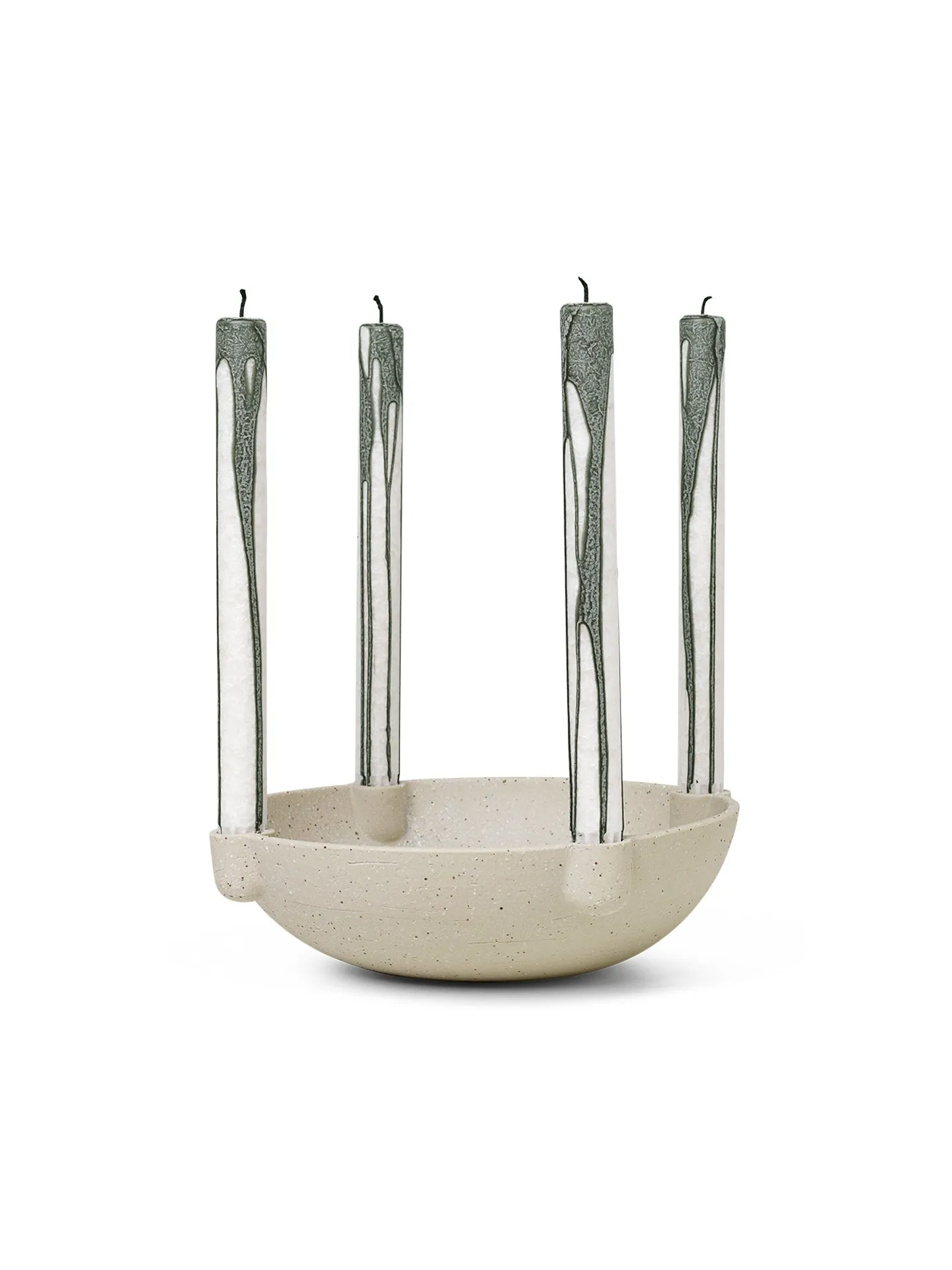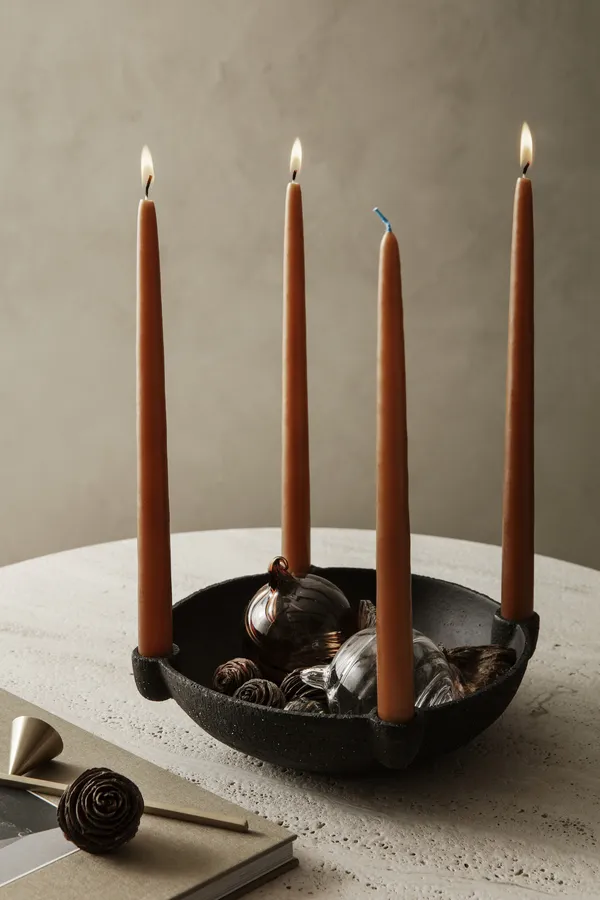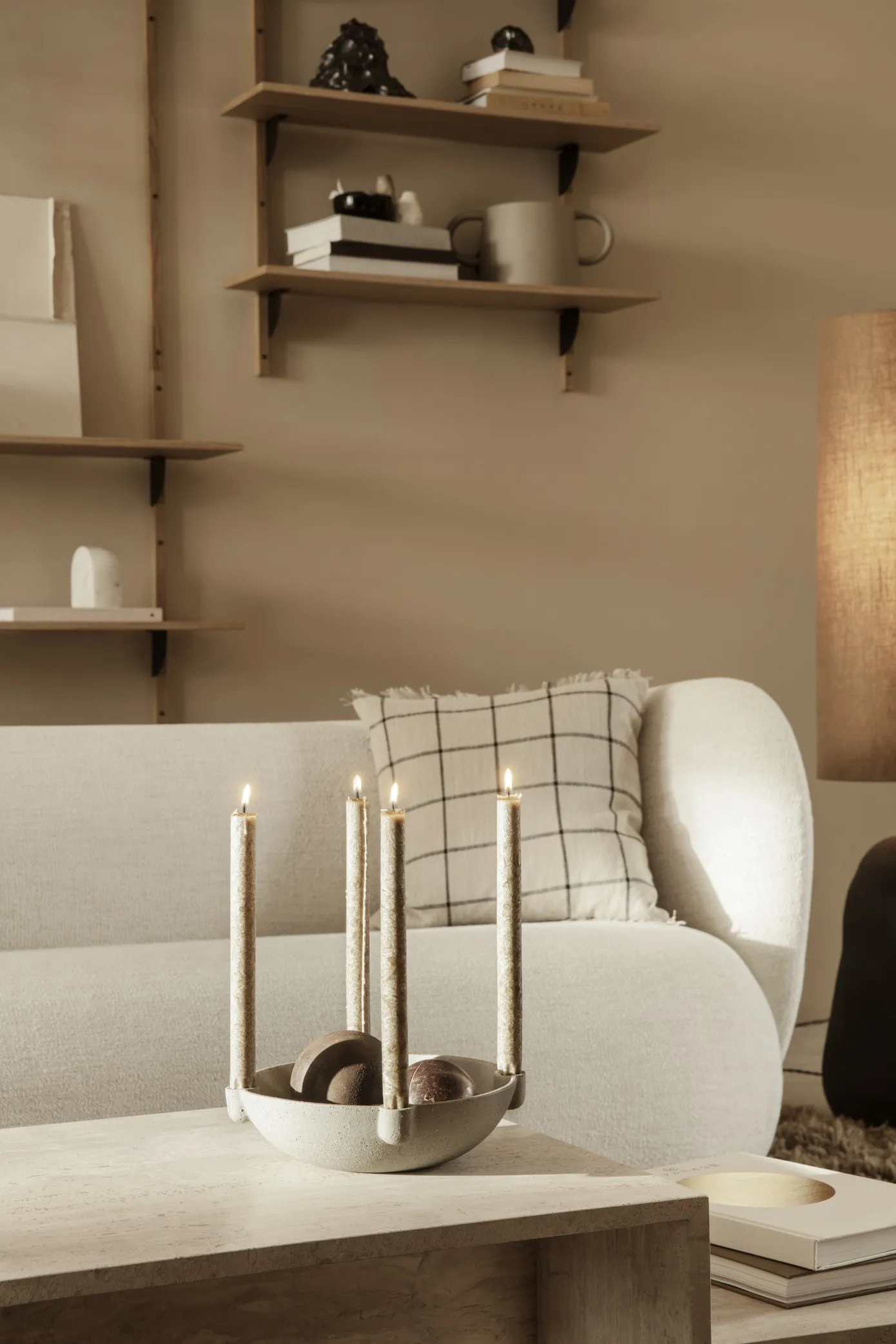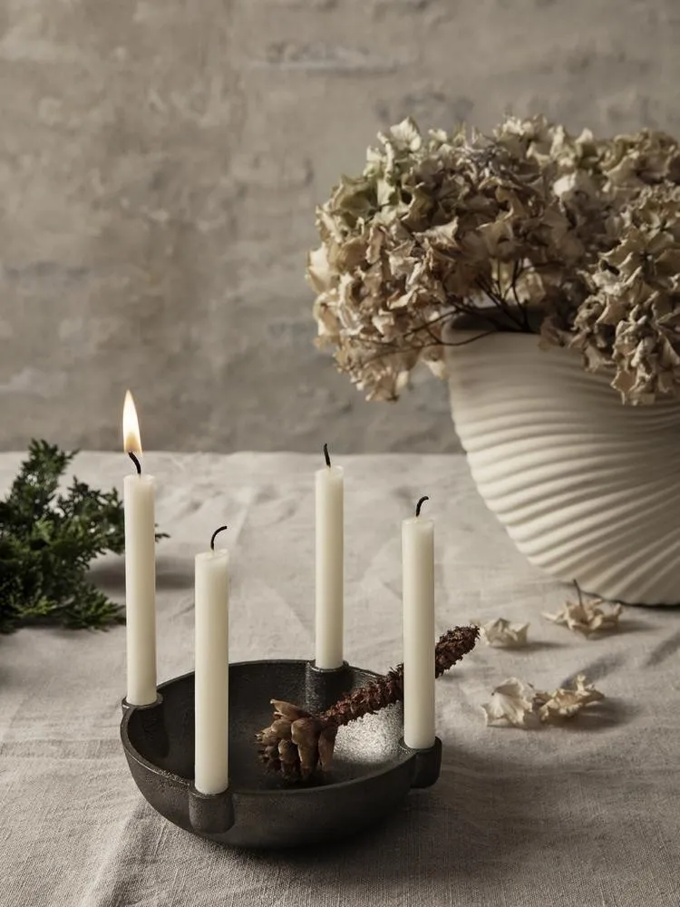 Ferm Living's stylish Bowl Candle Holder is sleek and elegant. A modern candlestick for four candles. Extinguish the candle before it reaches the candlestick. Two sizes, the smaller in brass and the larger in stoneware.