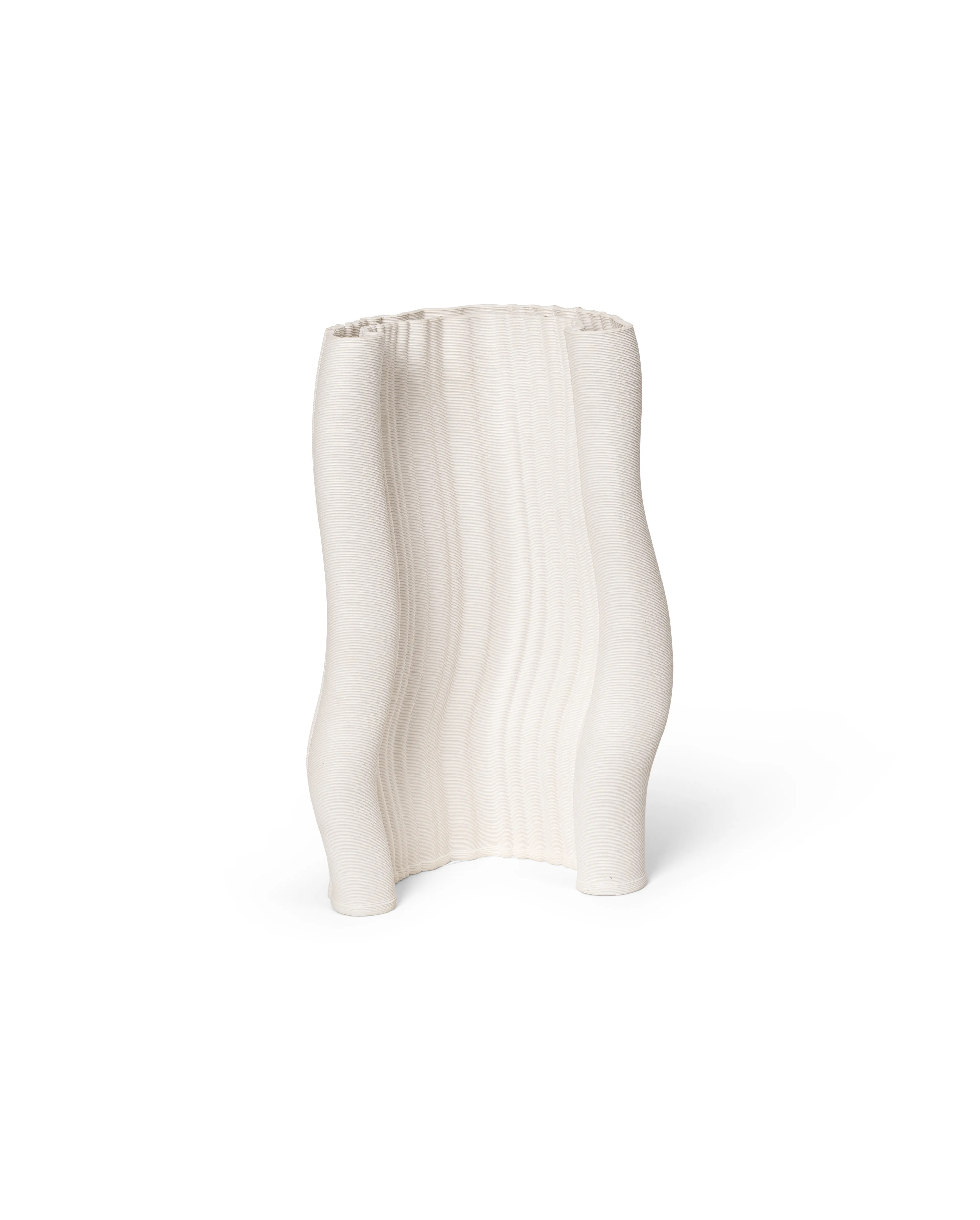 The Moire Vase from Ferm Living is soft and geometric with an undulating shape. The vase was created by printing a 3D model in clay. The vase is a beautiful eye-catcher on its own or with one or more flowers or branches in it.