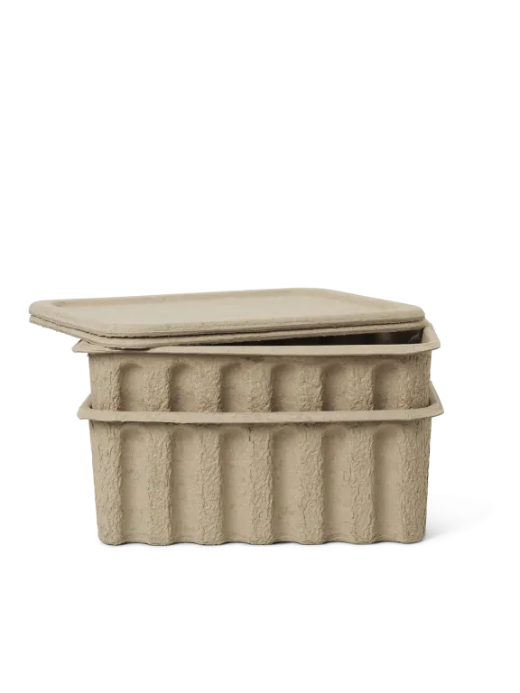 Paper Pulp Box stor - sold in sets of two. Made from 100% recycled paper, these molded storage boxes are one of the most eco-friendly storage solutions on the market right now. The timeless and stackable design from Ferm Living makes these not only practical and environmentally friendly but also stylish.