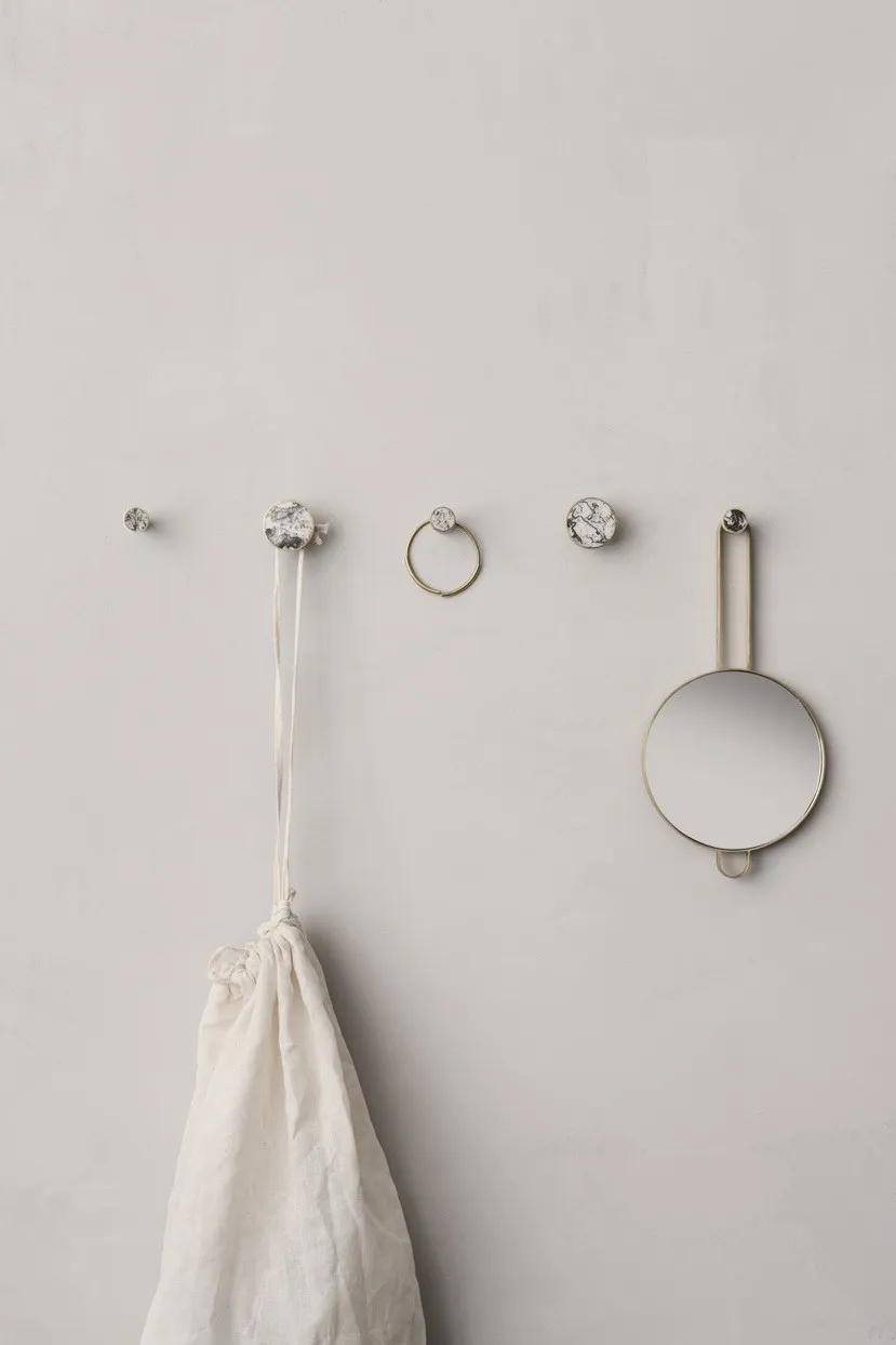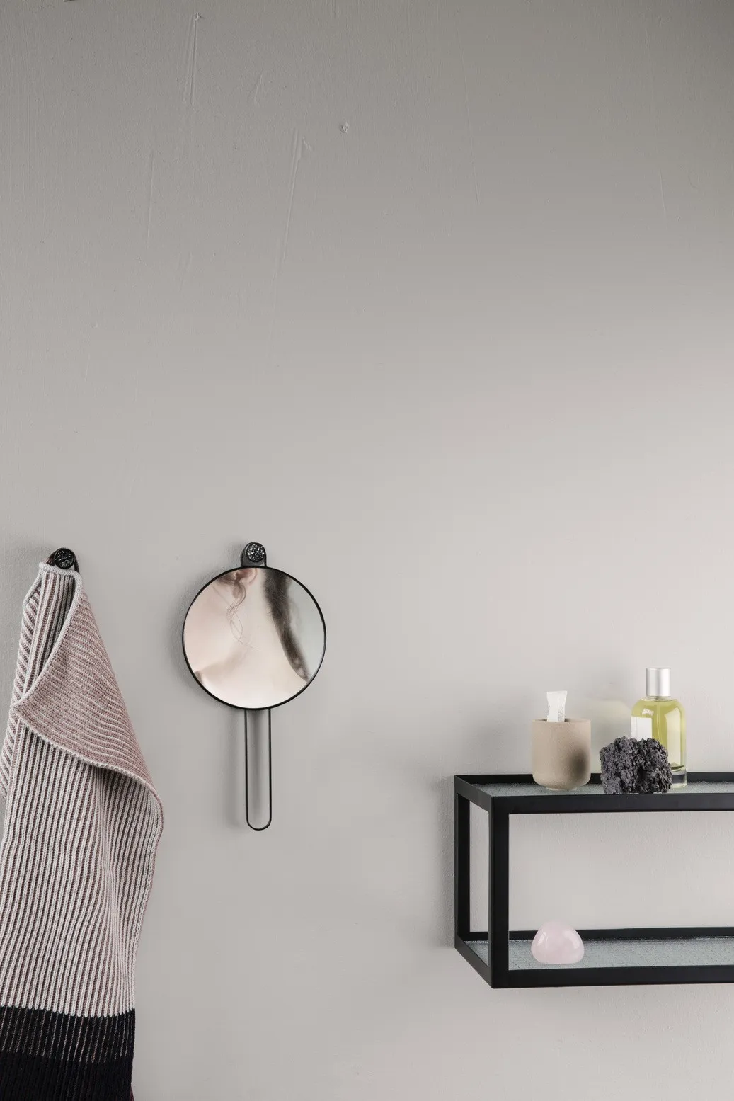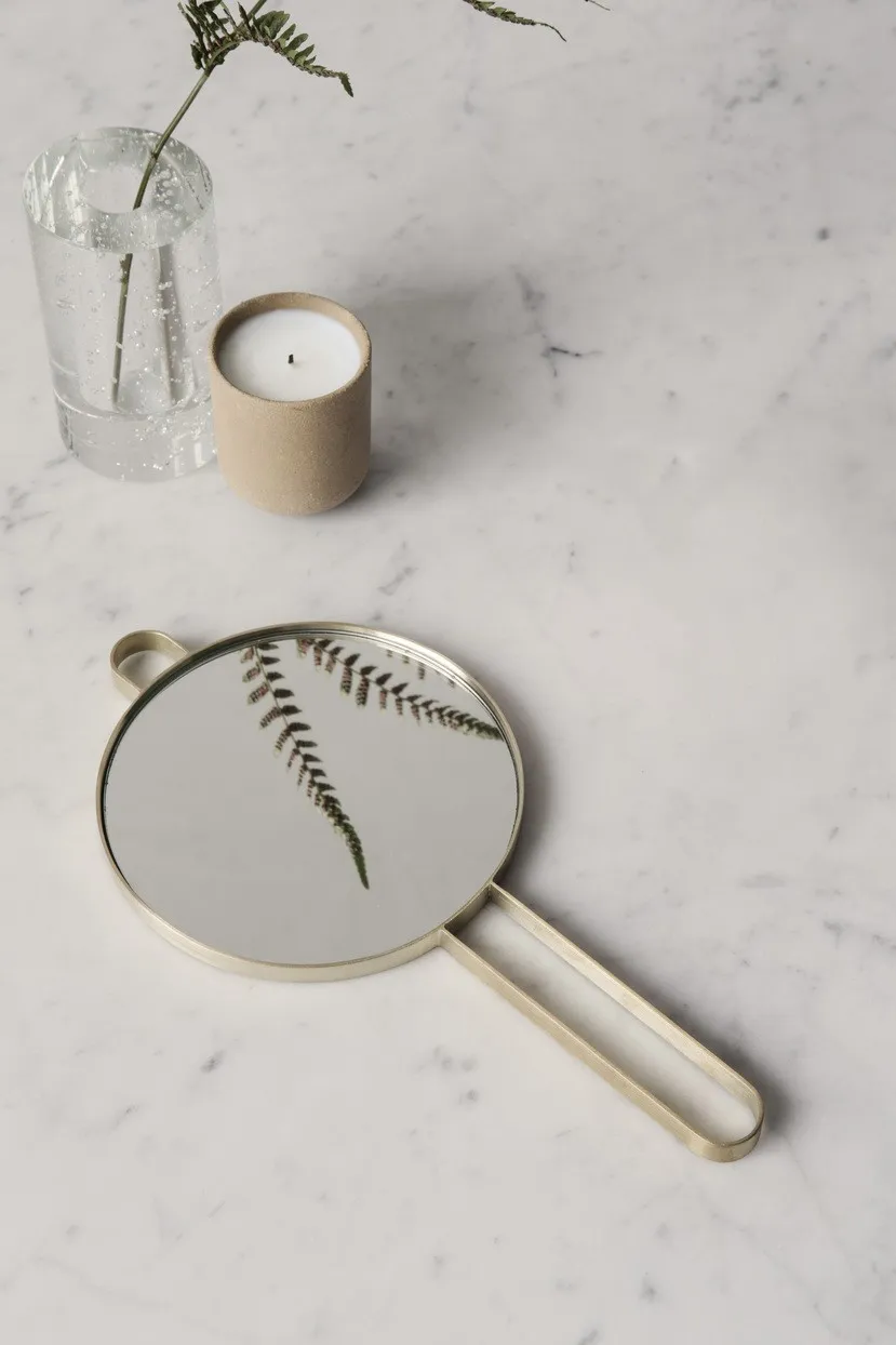 Ferm Living's hand mirror Poise is stylish and simple. It can be hung on a hook and has a natural place in the bathroom decor.