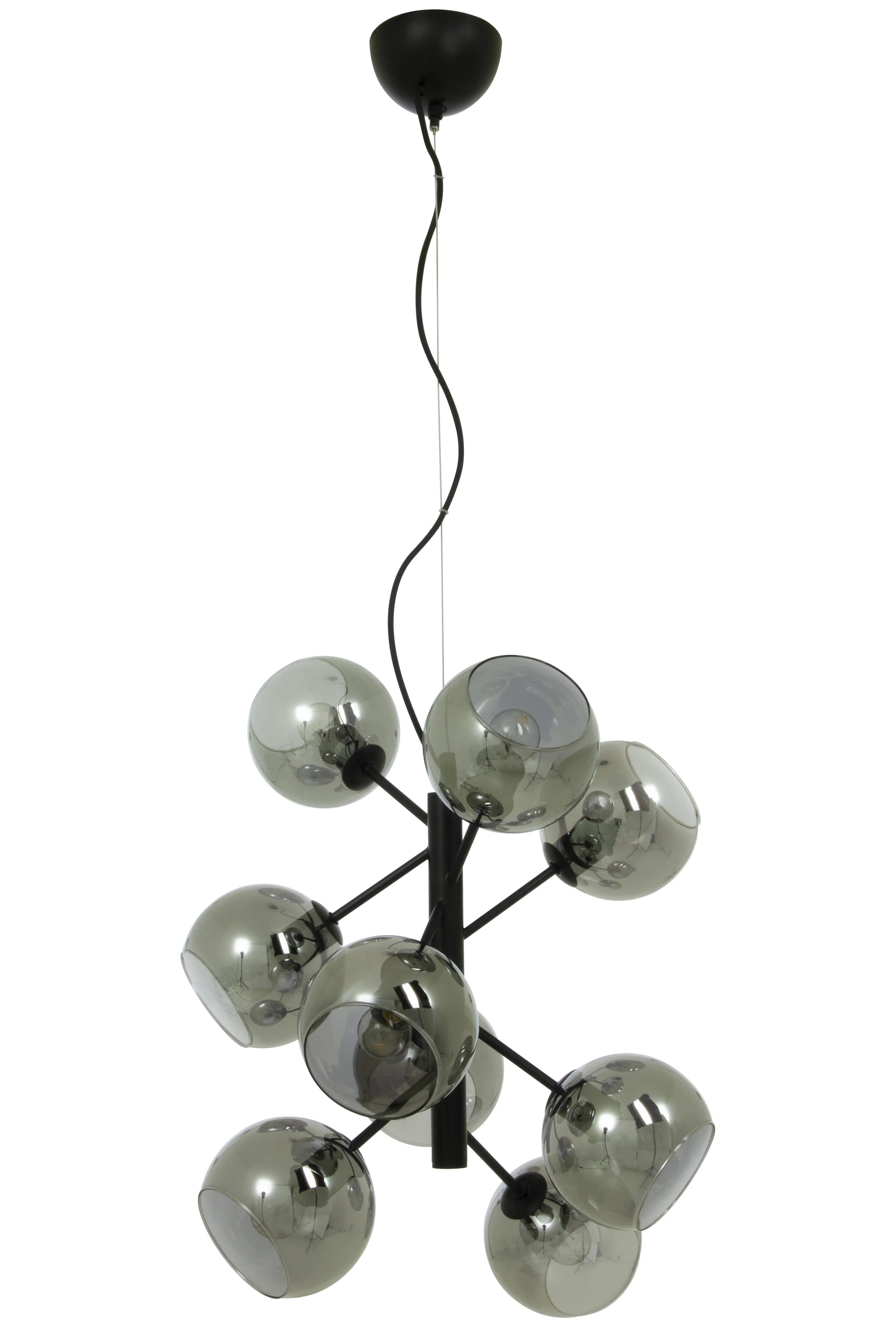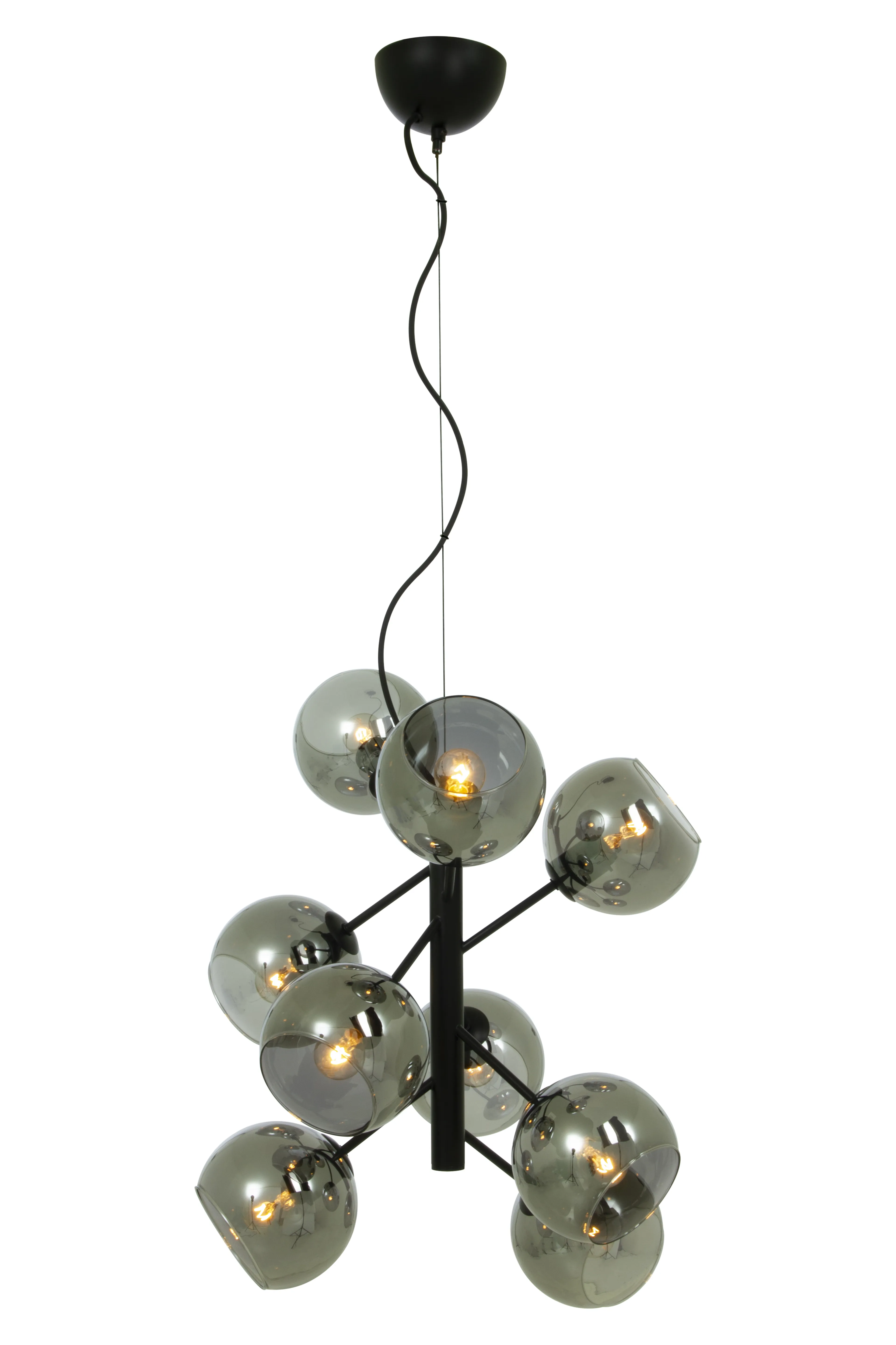 The modern pendant lamp Atom with nine smoke-gray glass globes in an asymmetrical arrangement is beautiful and exciting. A beautiful pendant lamp that is a focal point in itself. Nice in the bedroom, living room, or kitchen.