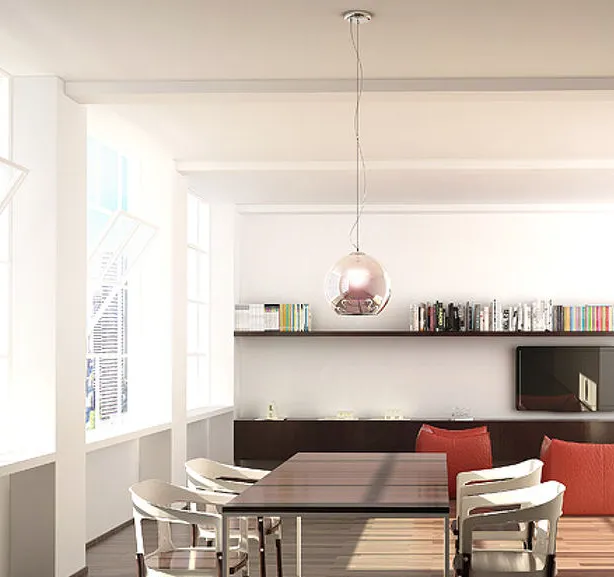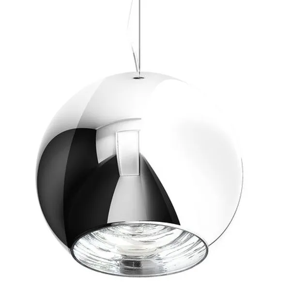 Rendl's modern Beau Monde design ceiling lamp shade is made of hand-blown chrome-colored glass. The interesting appearance of the shade is achieved by placing a thin layer of non-transparent metal on the glass. The surface of the shade contains small bubbles, making it very unique!