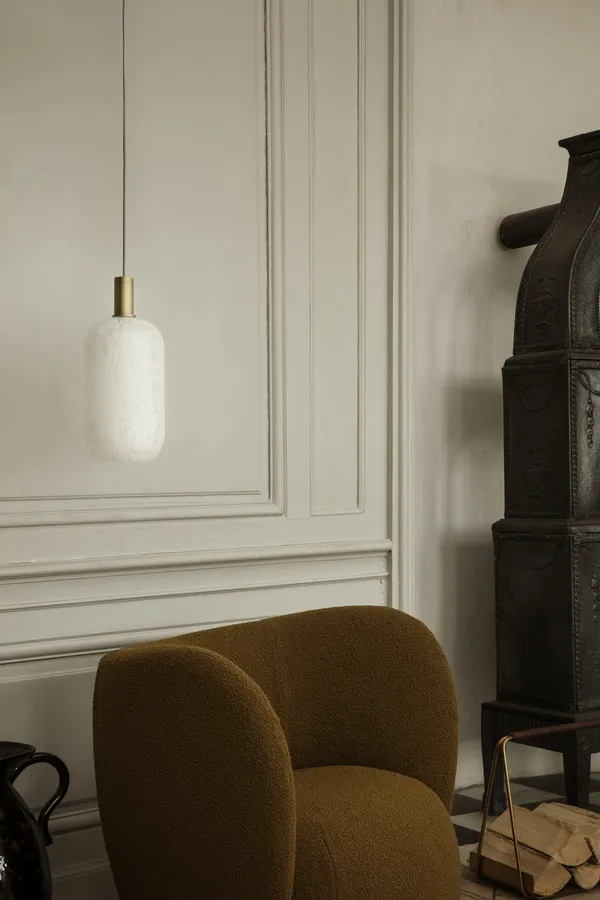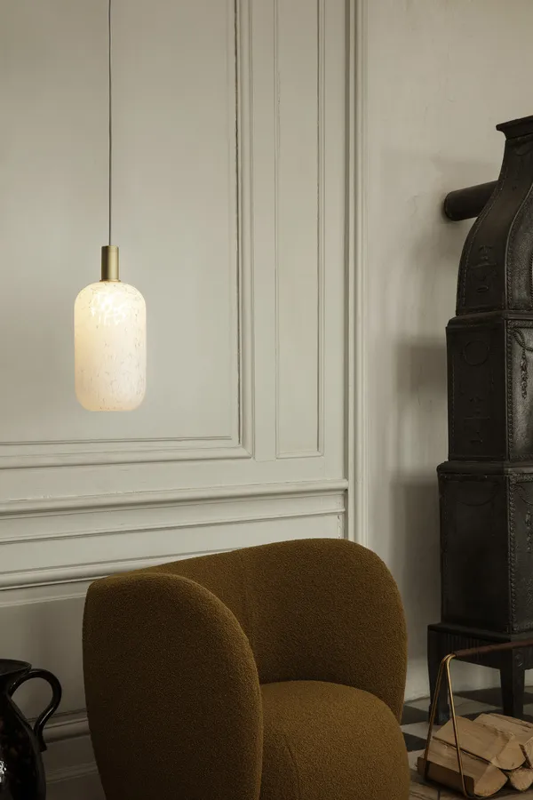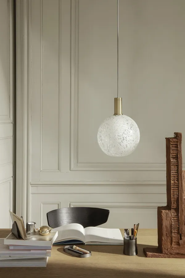 The lampshade Casca from Ferm Living in white and patterned glass is a modern ceiling lamp. Each lamp is unique. Combine with any lamp holder and cord from the Collect series.
