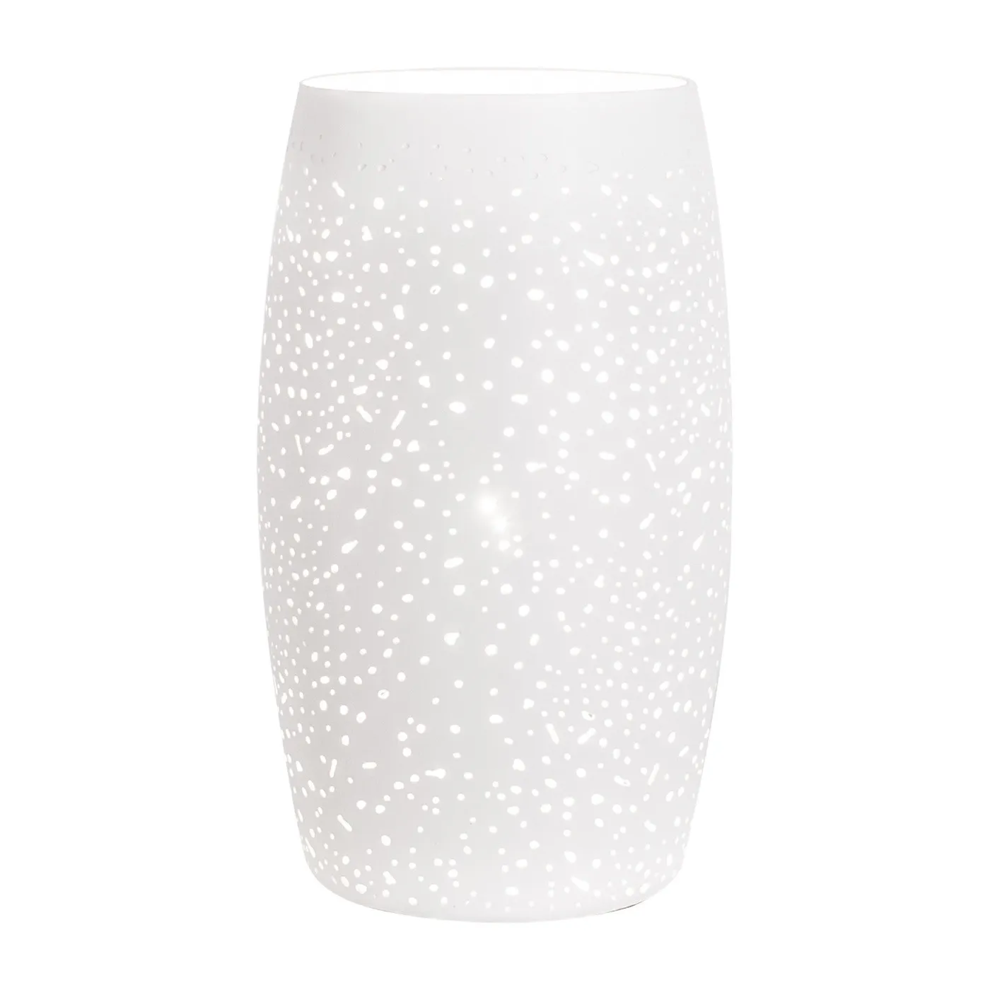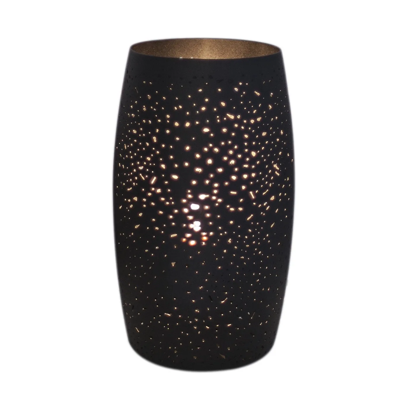 Colby round table lamp from By Rydéns with a metal shade. The light from the lamp seeps through the perforated and uneven holes, creating a spectacular visual effect. Suitable for both homes and public environments.