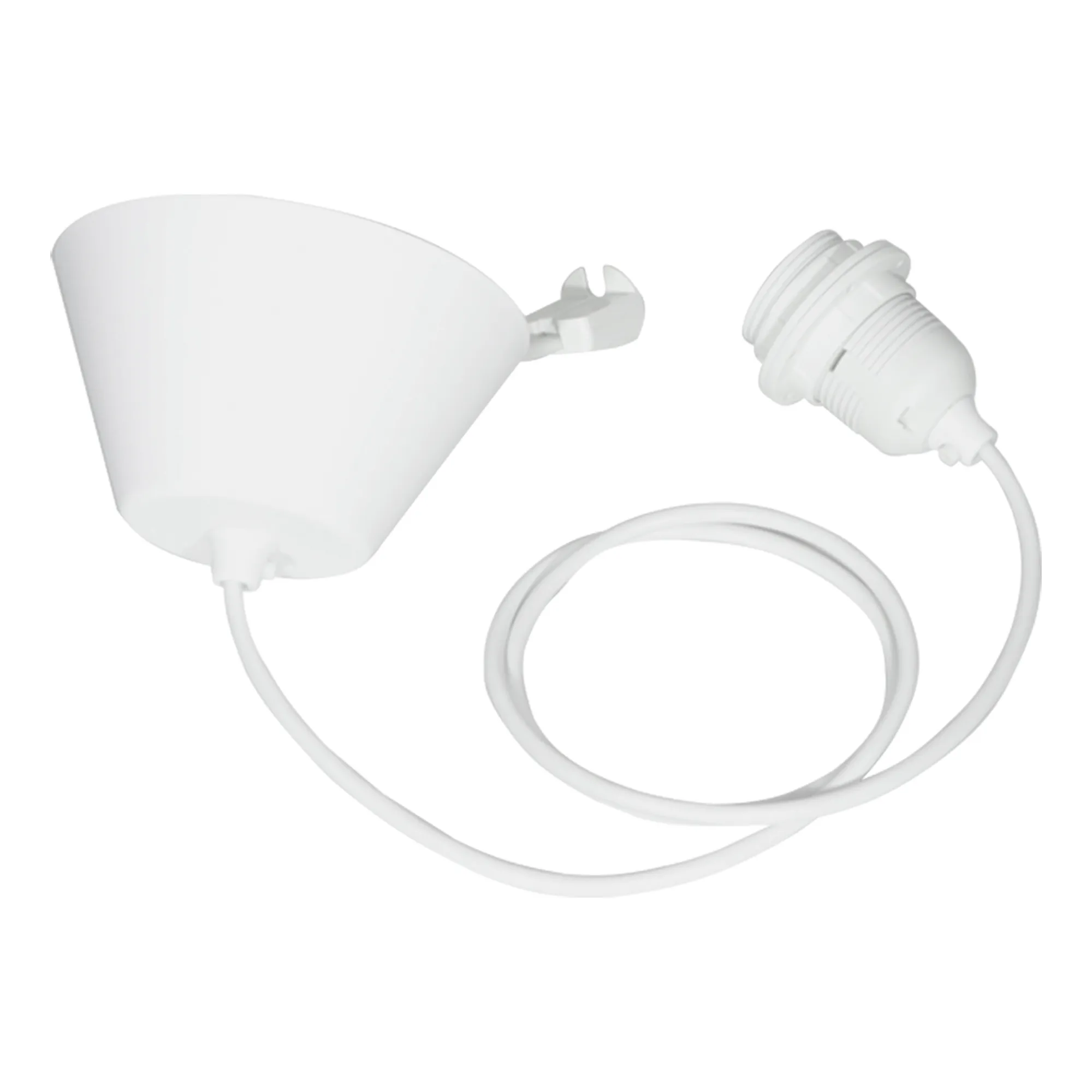 Ceiling lamp suspension in white or black plastic that fits for ceiling lamps with E27 lamp holder. The set includes cord, socket, and plug.
