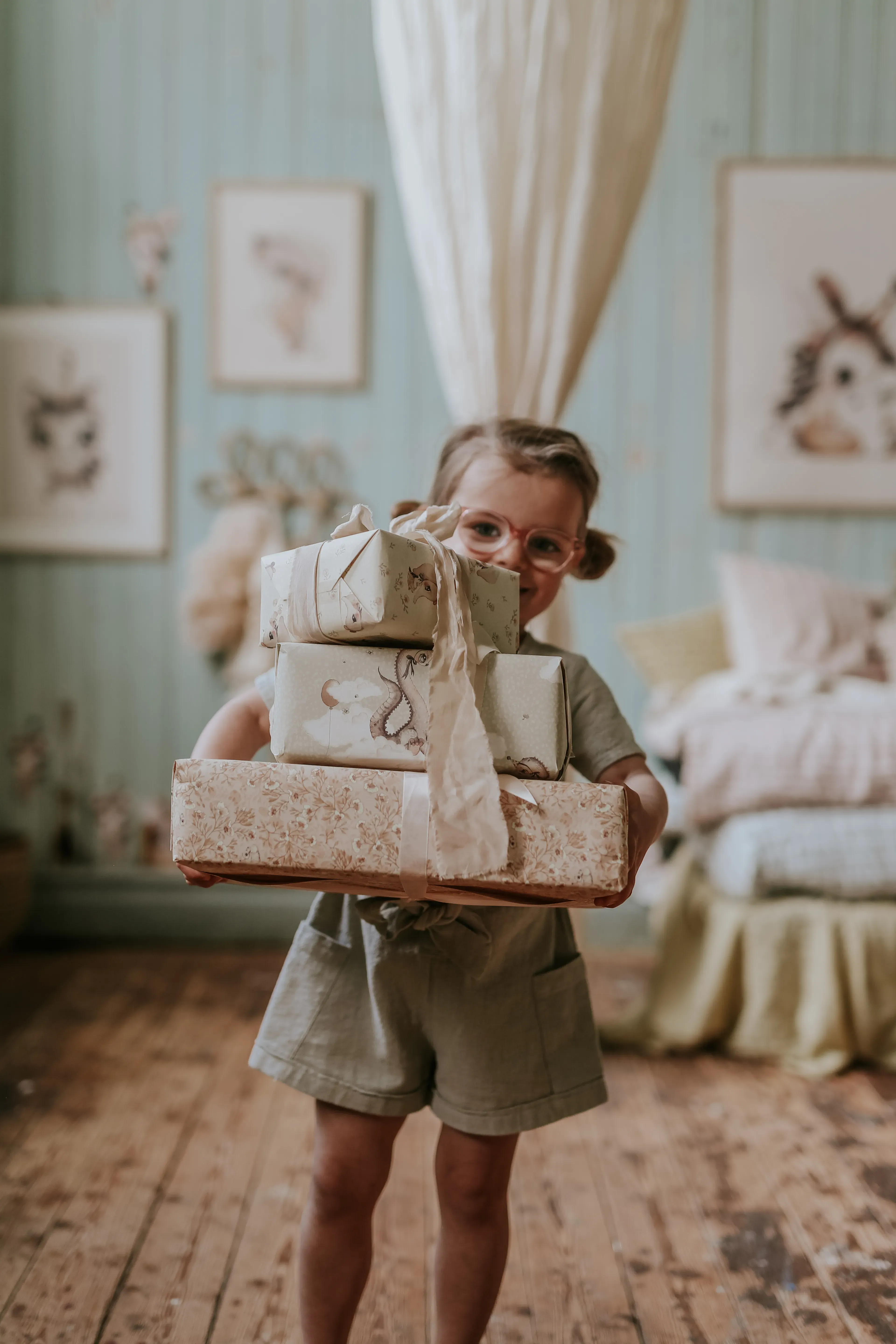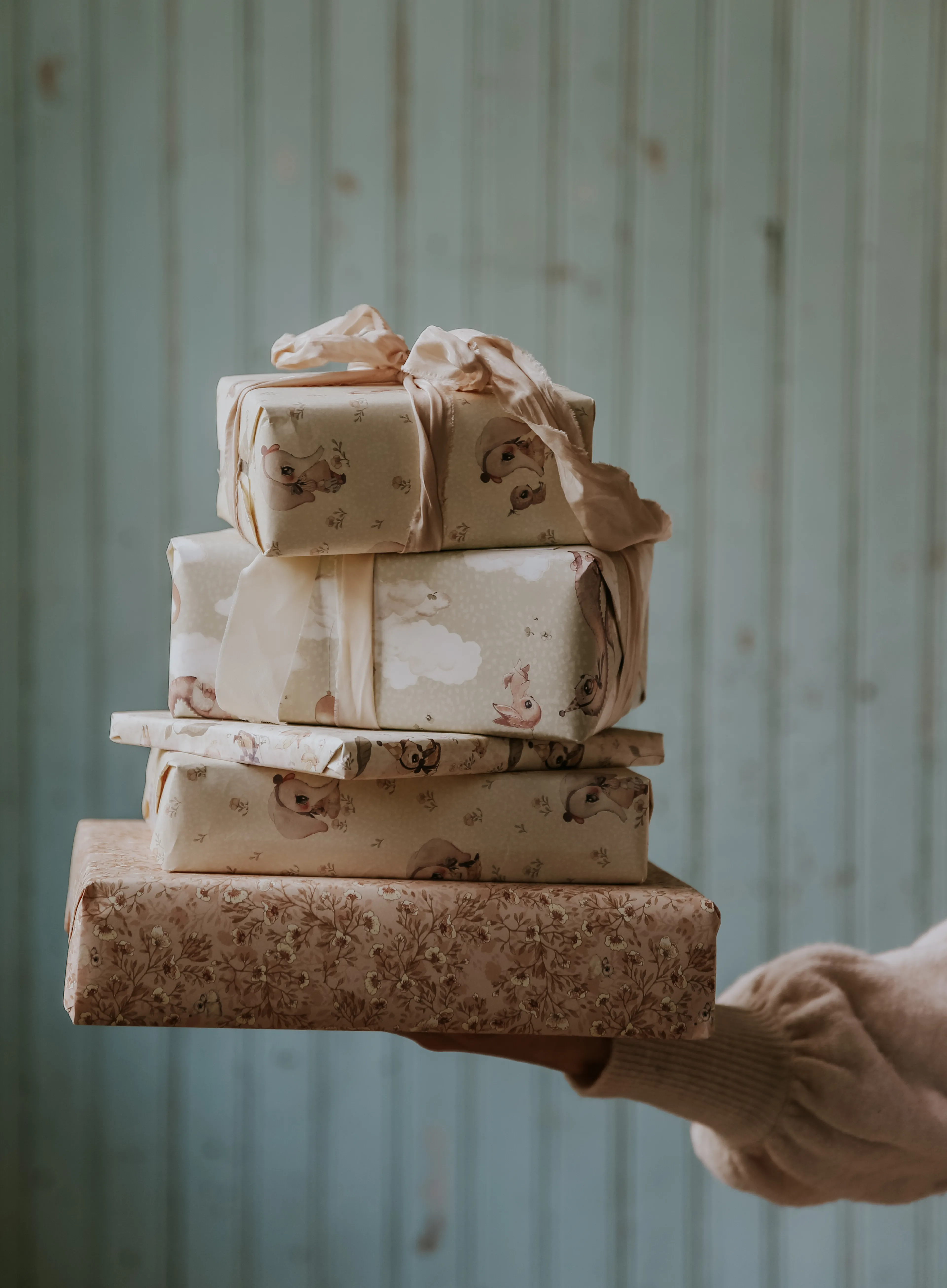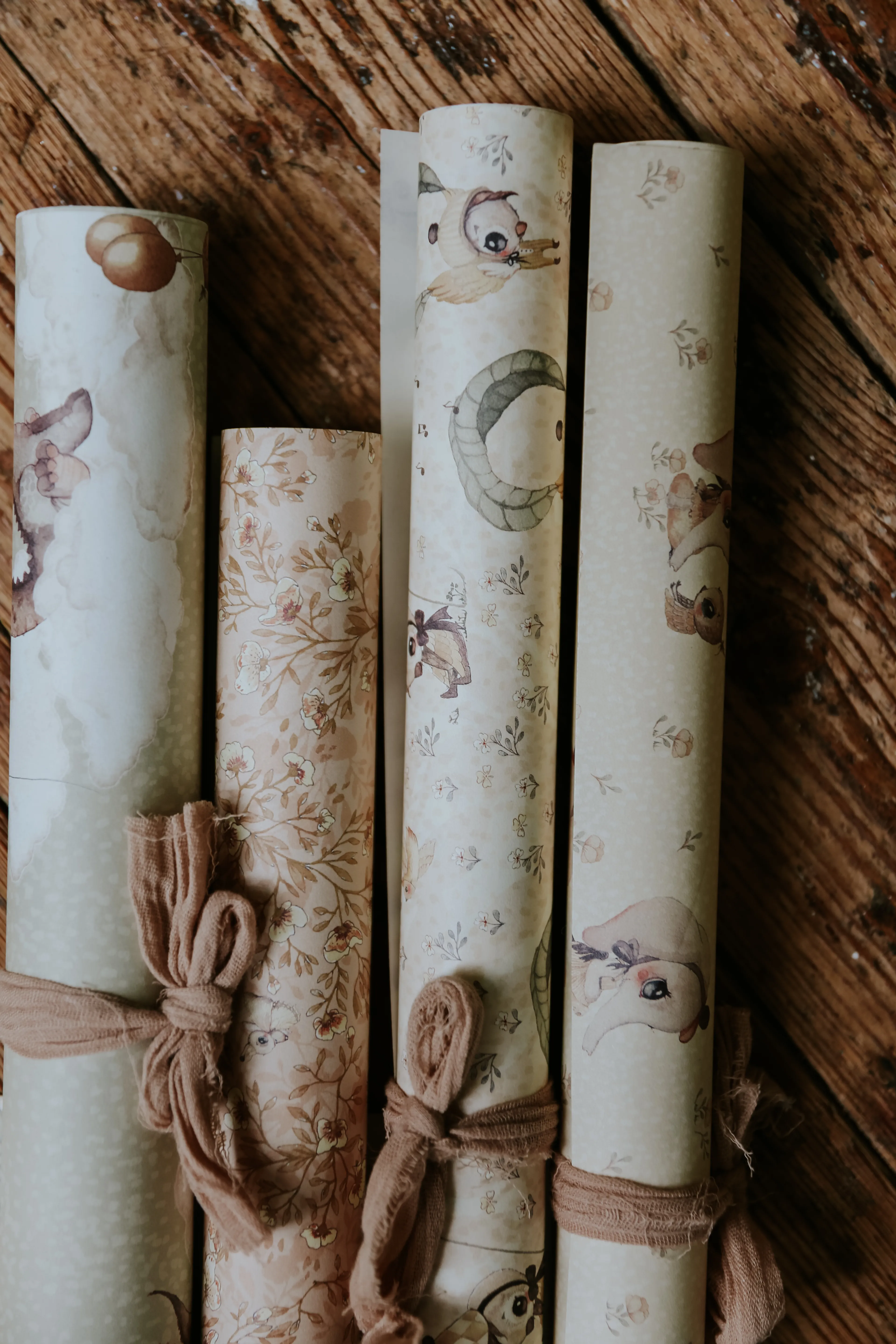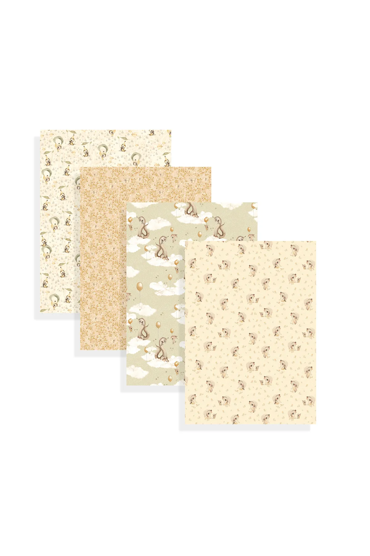 Four sheets of paper for gift wrapping or crafts. The designs come from the Baby Mighetto collection.