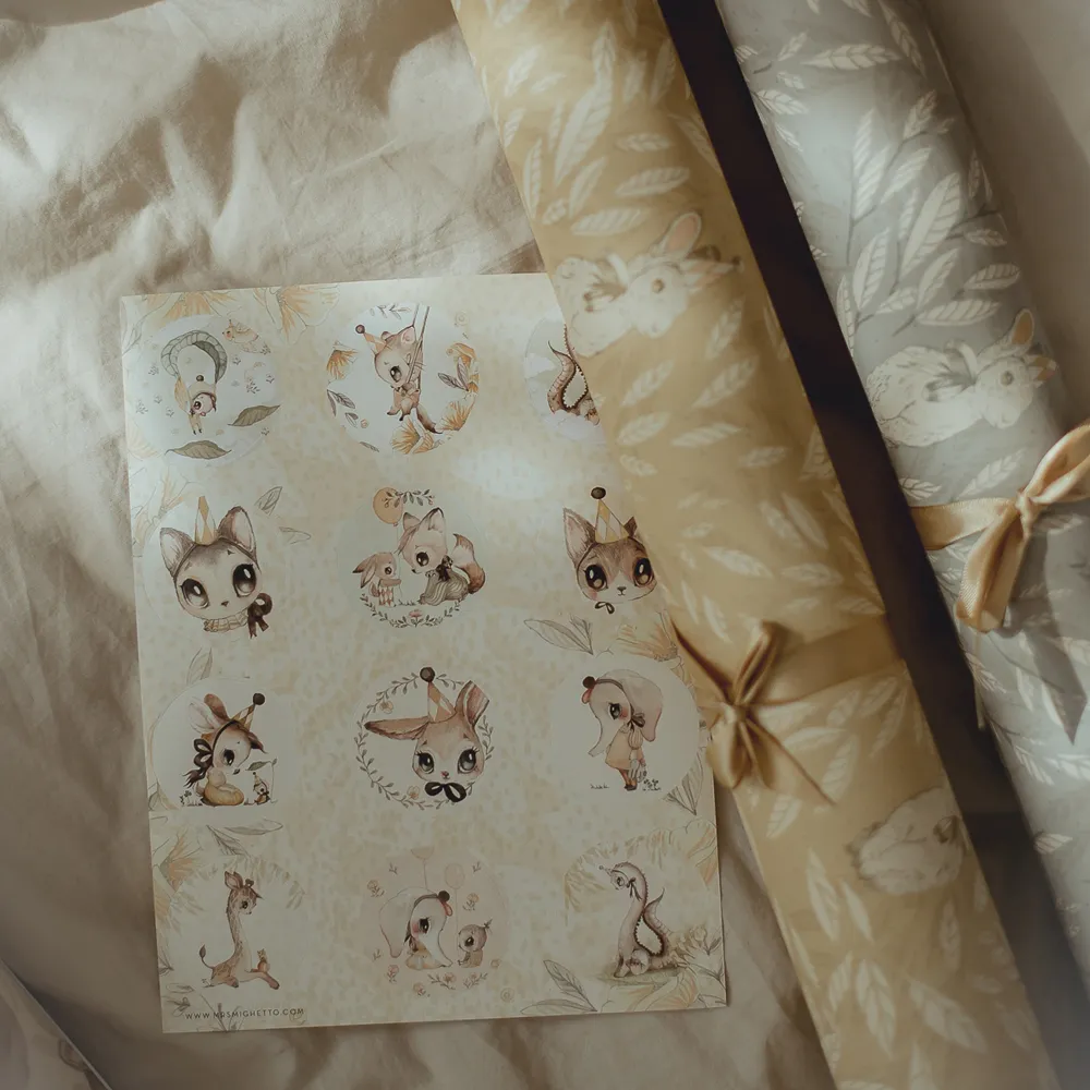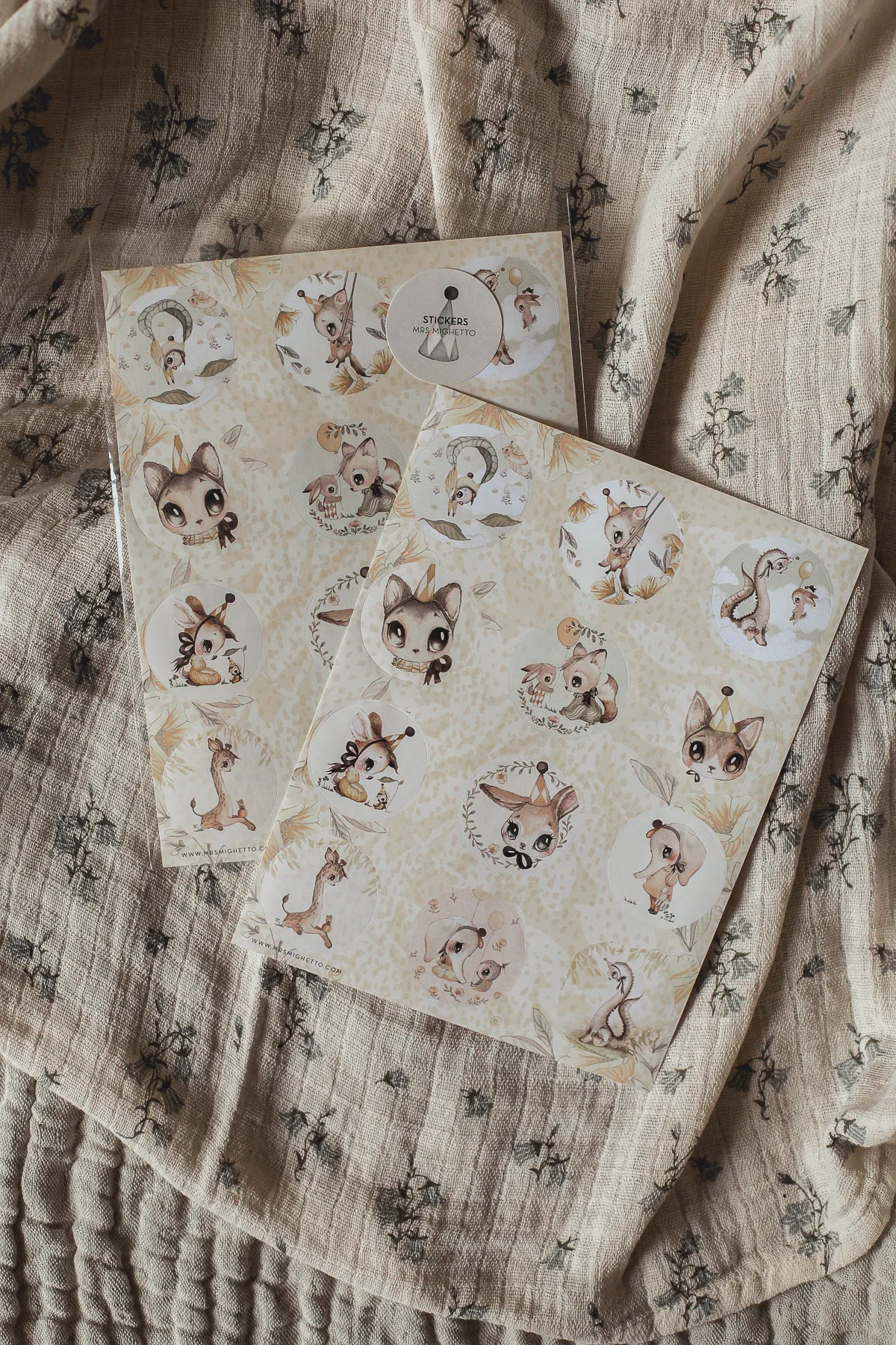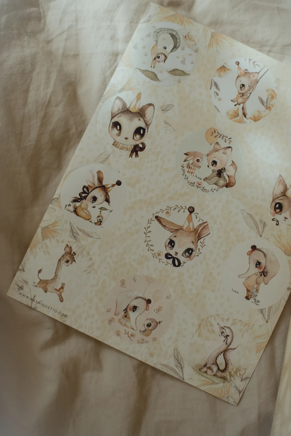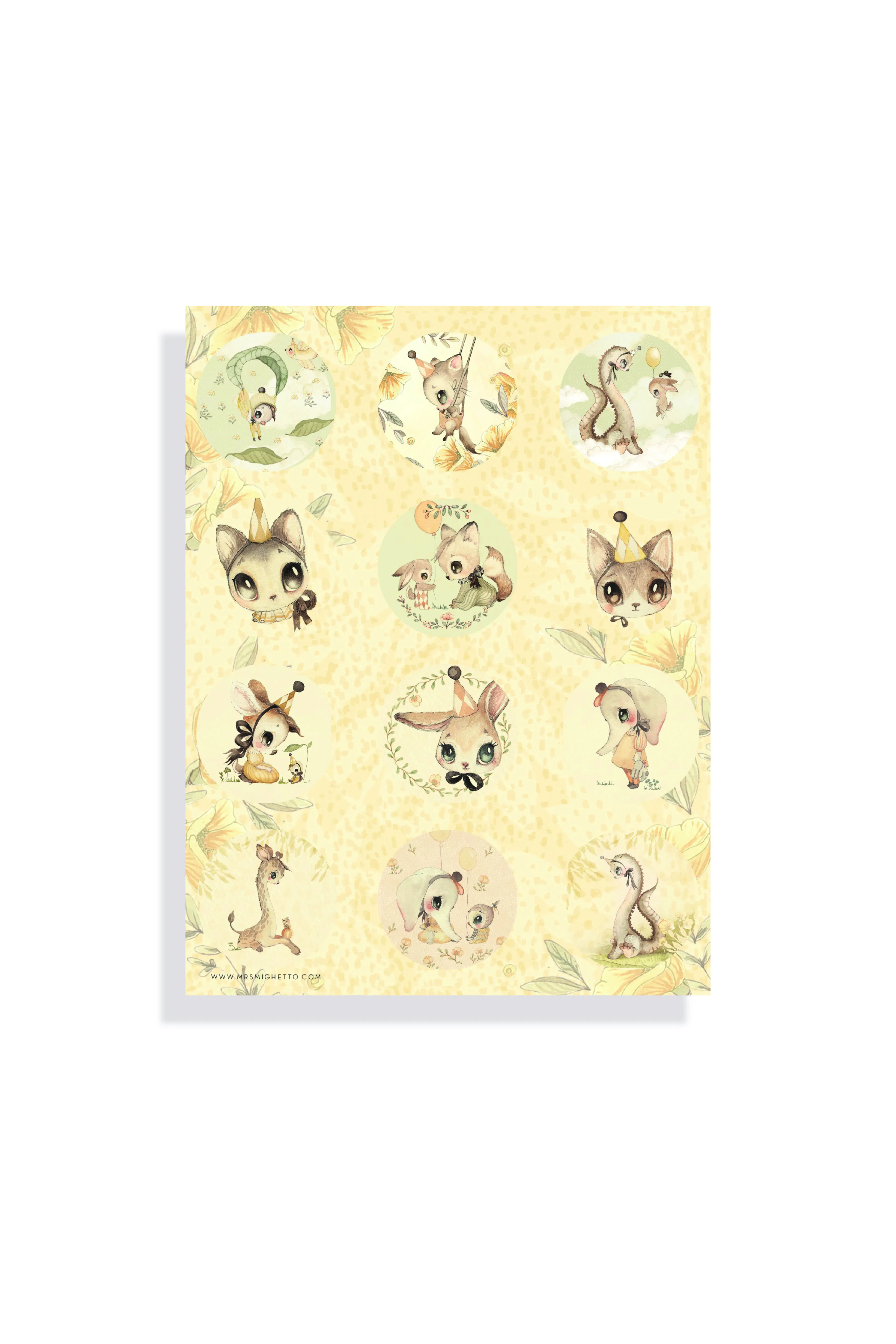 Baby Mighetto stickers with cute characters from the Baby Mighetto collection. Twelve stickers on an A5 sheet. Cute for decorating invitations or packages or for personalized seating arrangements.