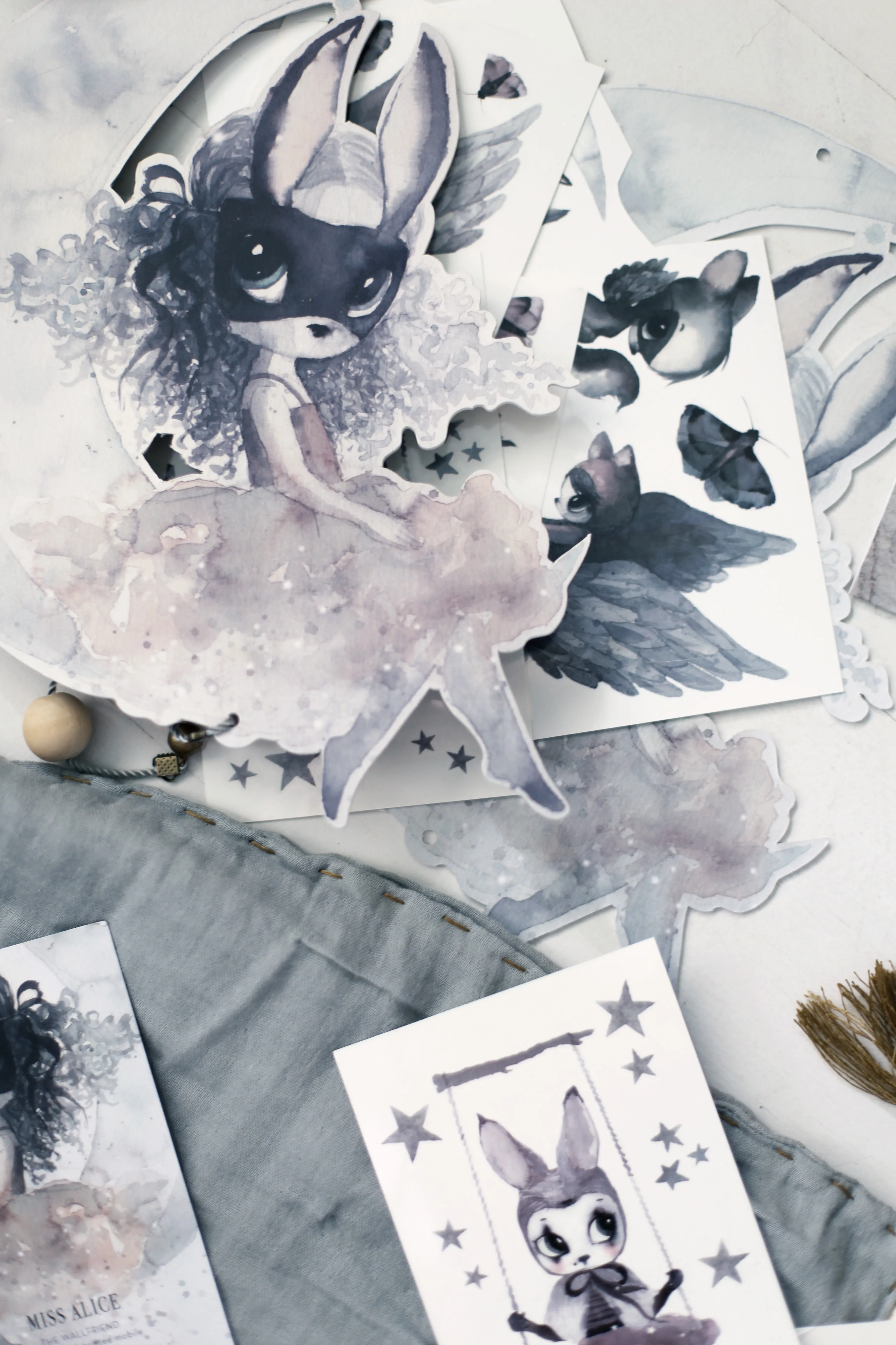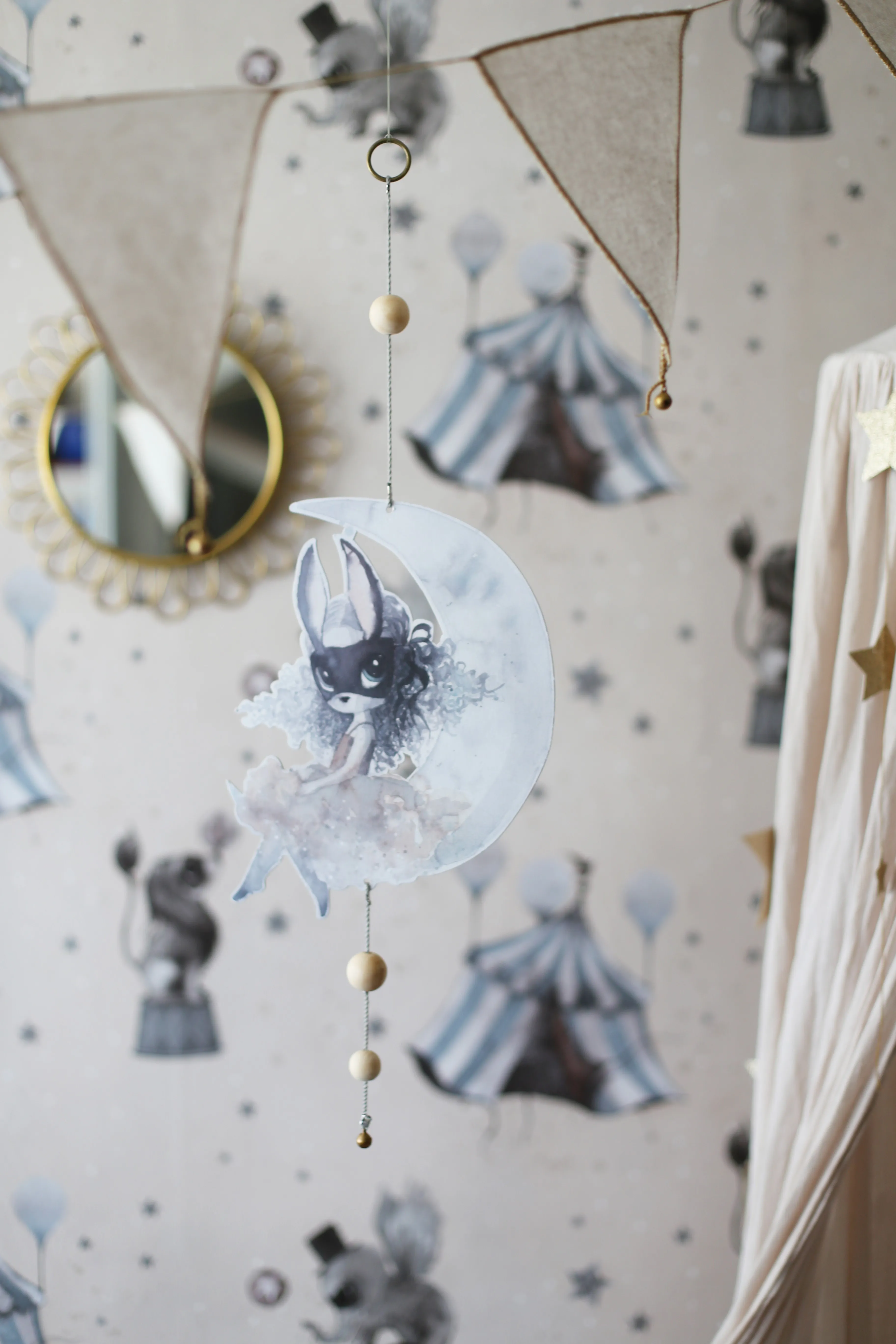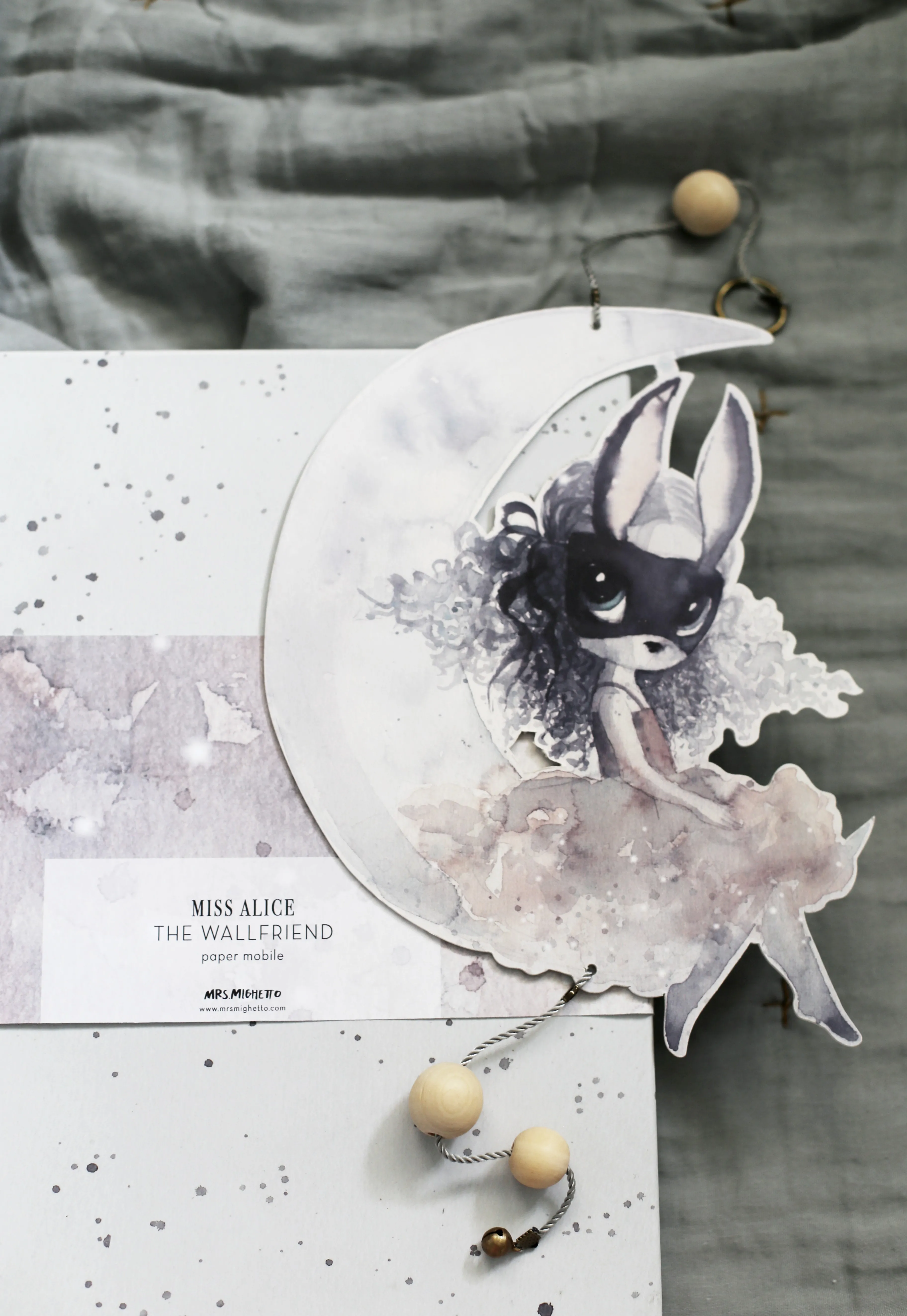 Mrs Mighettos Miss Alice magical paper mobile for children's room decor! The mobile is printed on both sides and can be hung in windows, from the ceiling over the bed, or above the changing table.