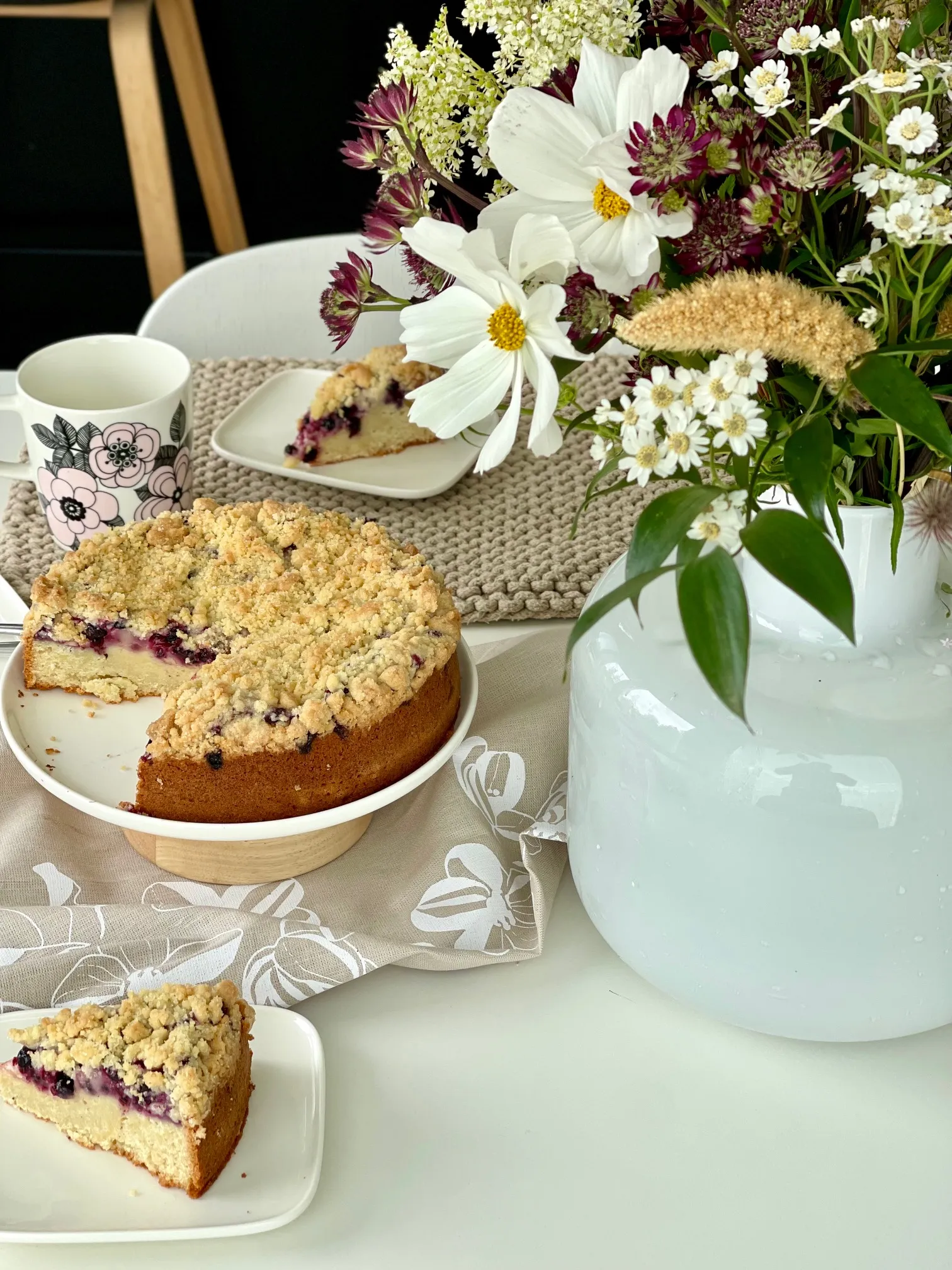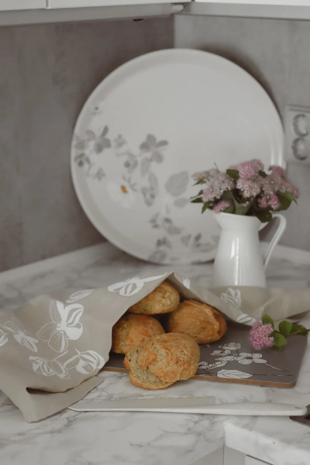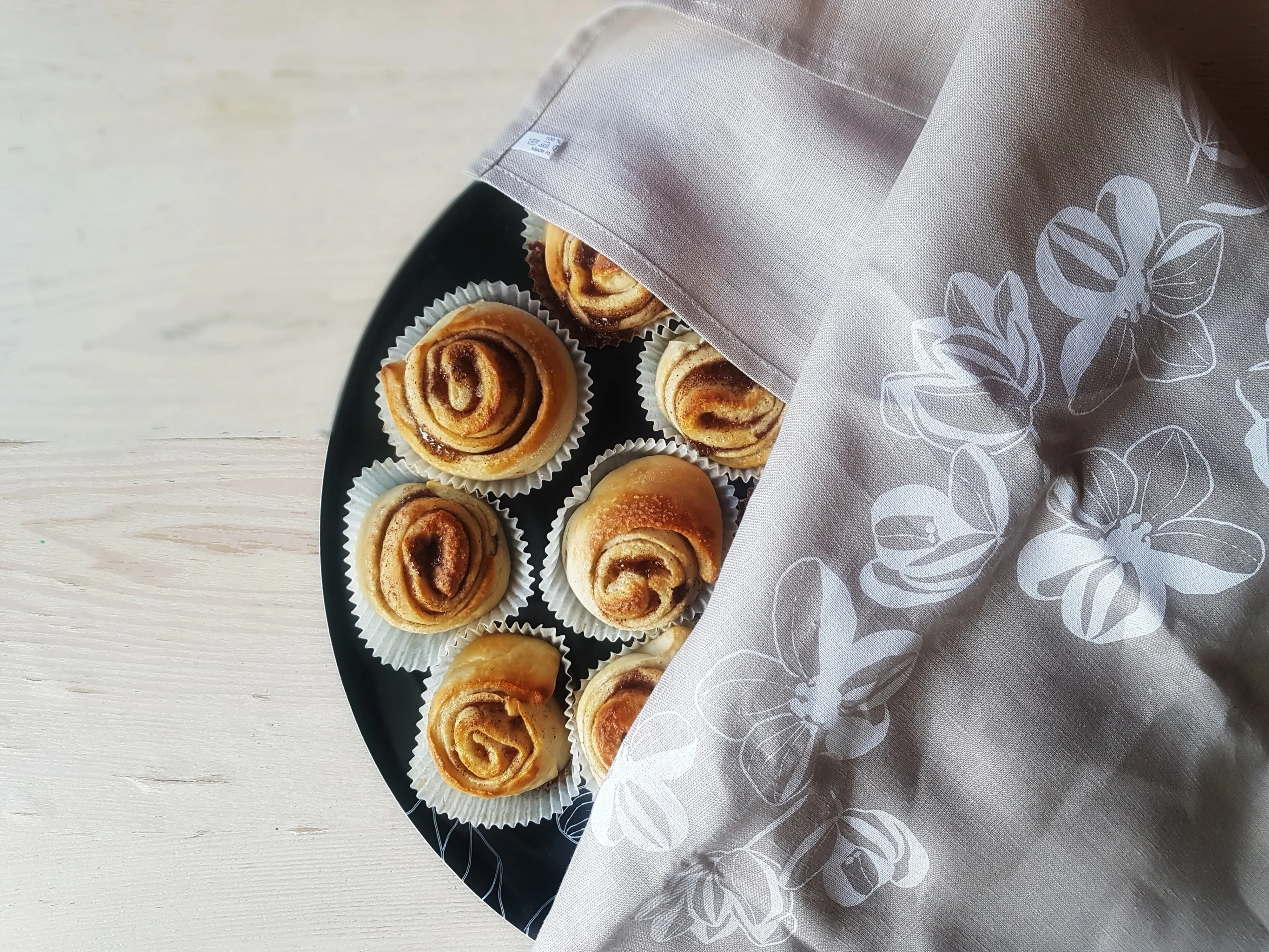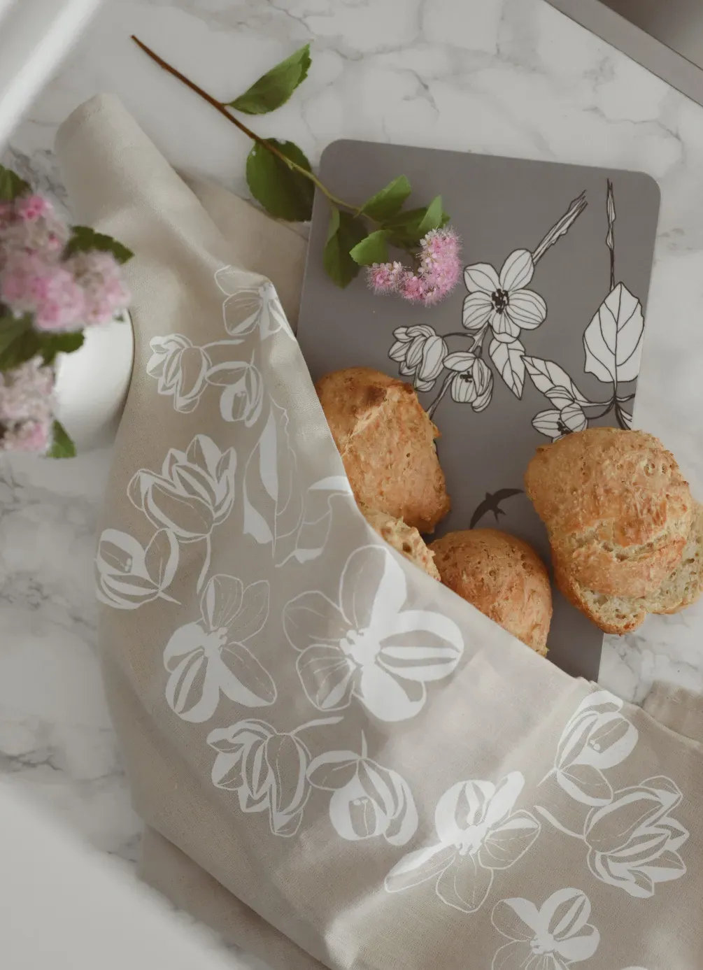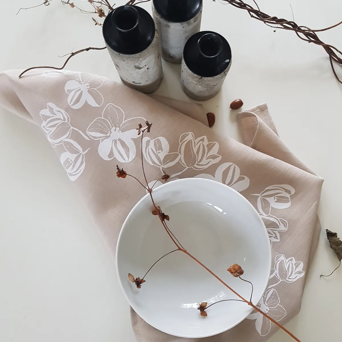 The naturally colored linen kitchen towel Äppelblom matches the Johanna tray with its apple blossoms. The towel is suitable for all seasons, both Christmas and summer, and features a harmonious constellation of apple blossoms inspired by other Österbotten trays.