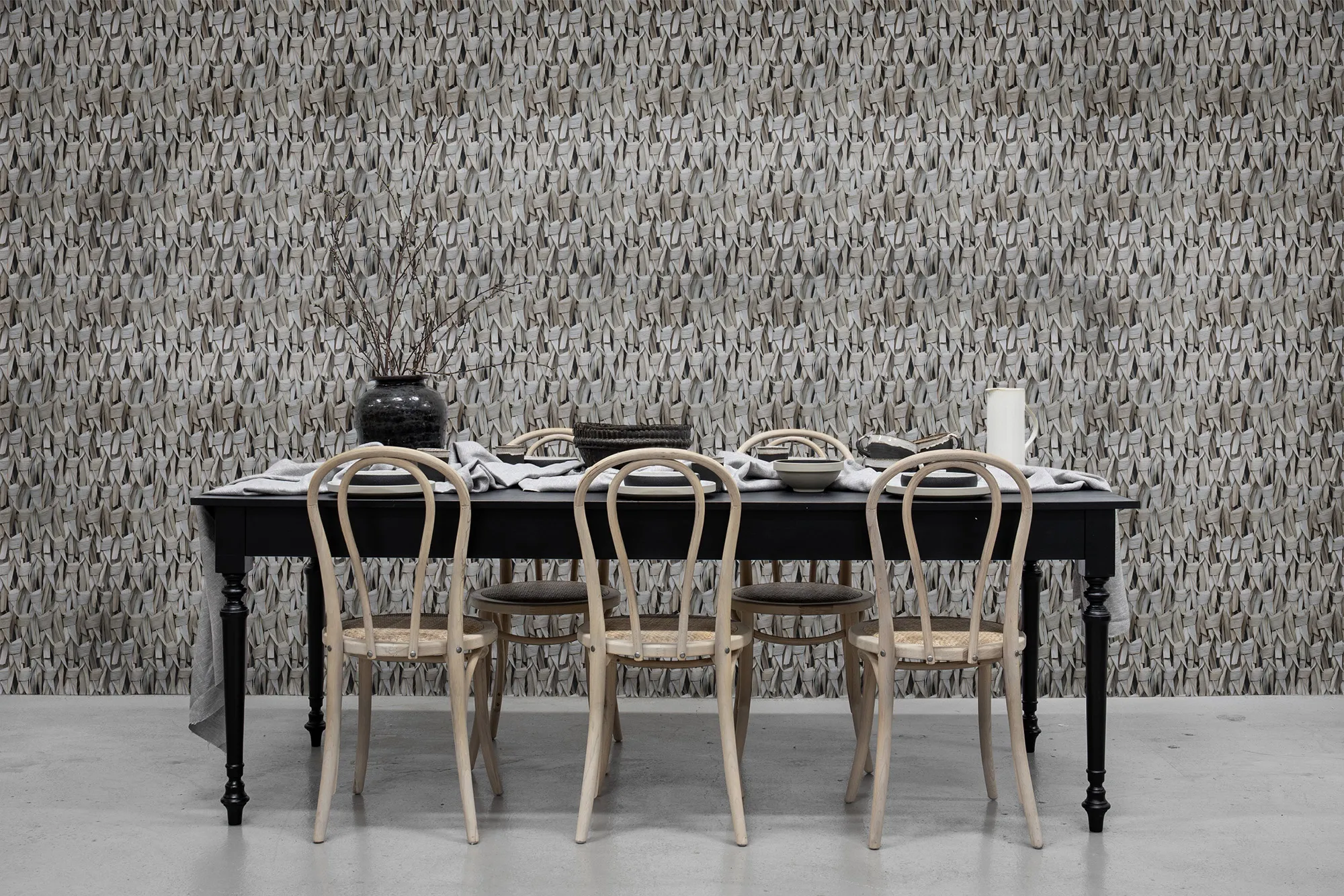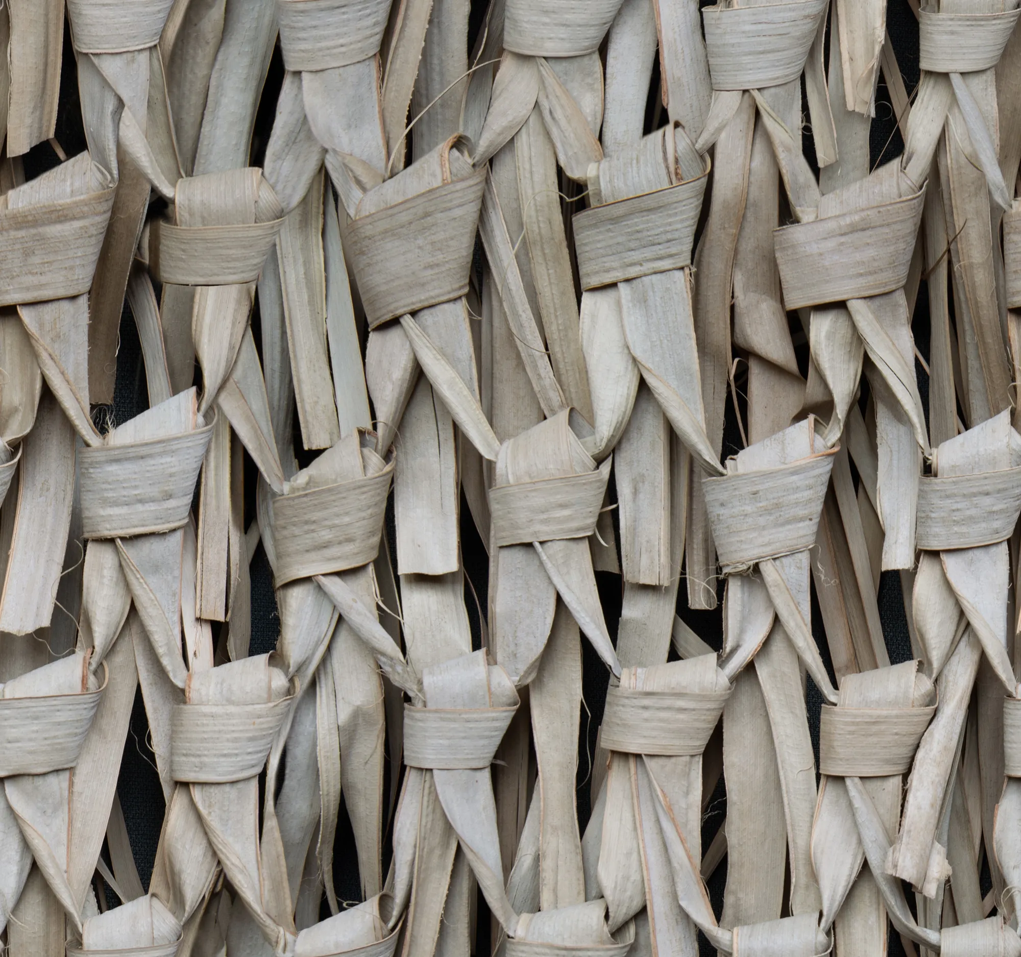 Muraltapeten Calm slows down the pace in a hectic world. The dried, hand-tied banana leaves in a dense, regular pattern create peace of mind. A calming mural wallpaper for the dining room or living room.