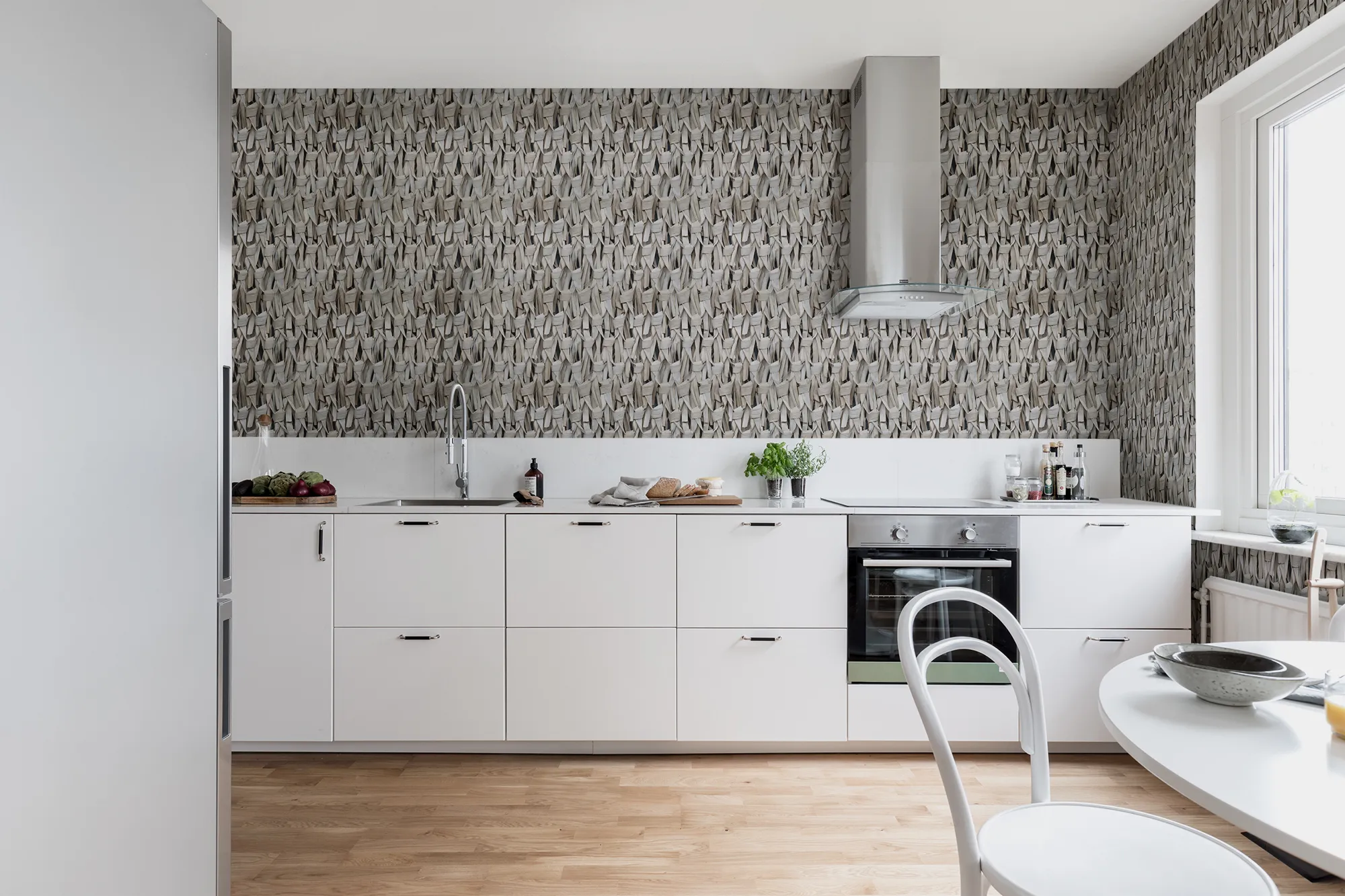 For ordering, the width and height of the wall are needed. We recommend adding 5 cm to both the width and height just to be safe. Measurements for doors, windows, or cabinets cannot be reduced if the wallpaper pattern is to remain intact.